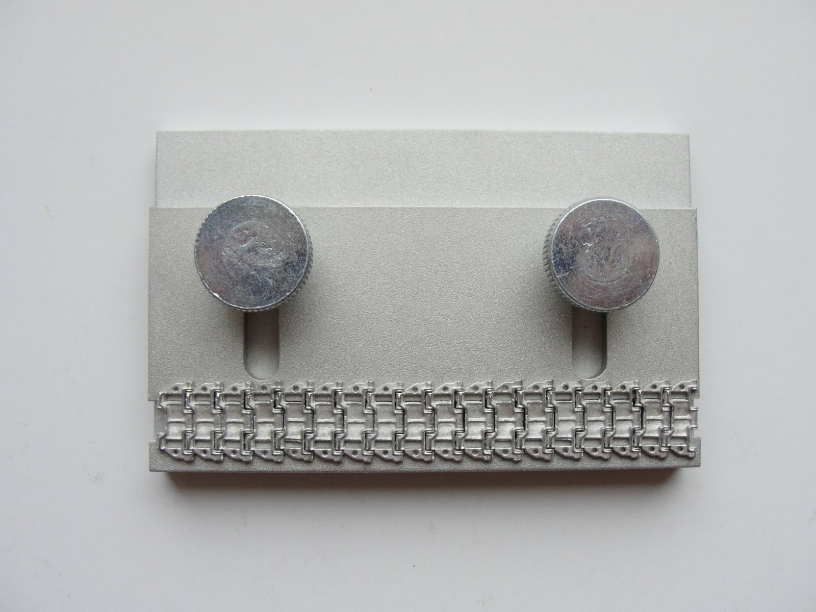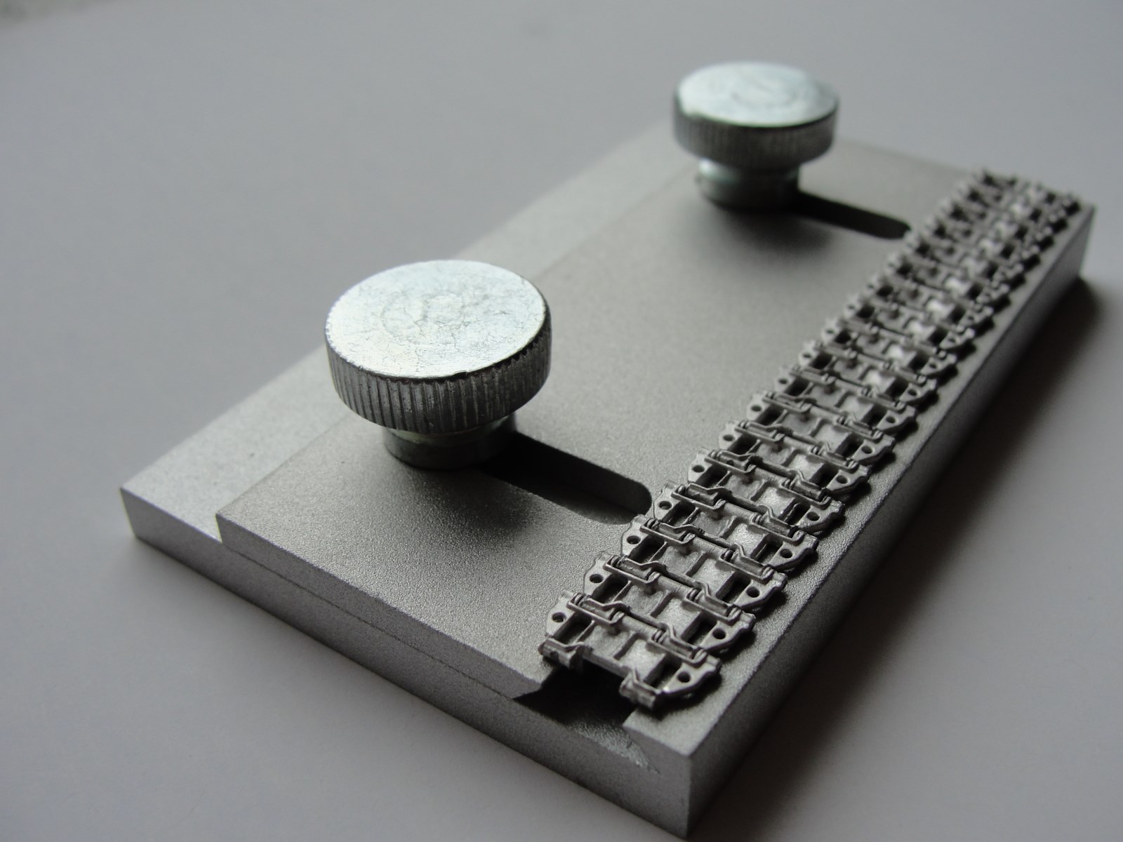 Track links jig is a handy tool to help you with assembly of any single track links, workable or non workable, resin or plastic ones. The tool takes all tracks available, its sliding part allows to hold links 6-24mm wide, while a holding stick provided helps to position and hold line of links as required for glue application. You can control easily gaps between links, and length of the track sections according to that. With this tool you will get perfectly straight tracks with all links at the same level.