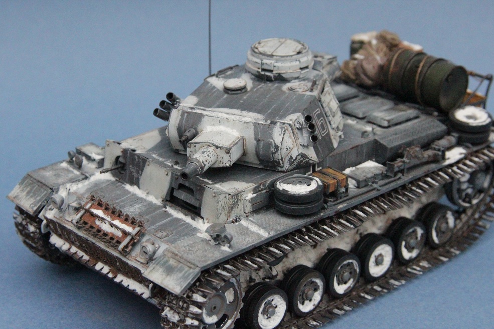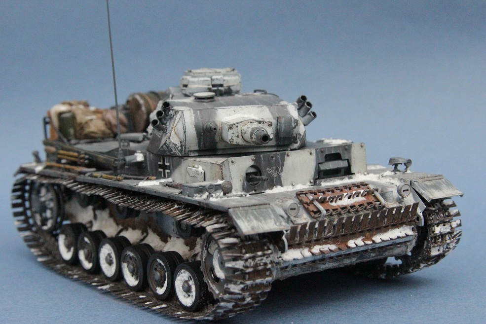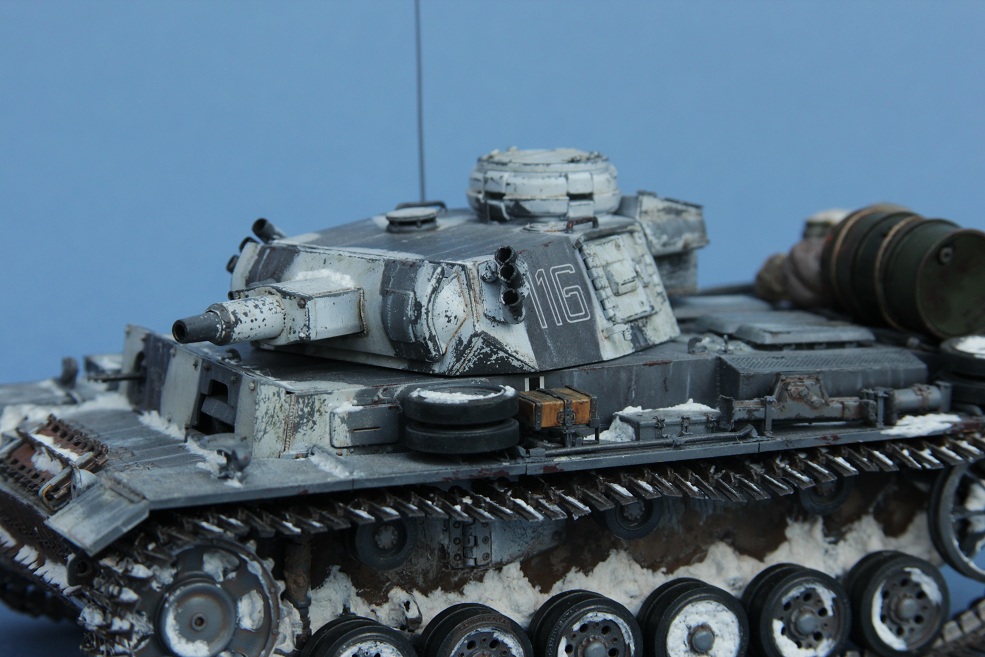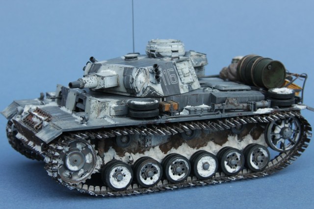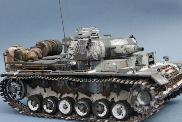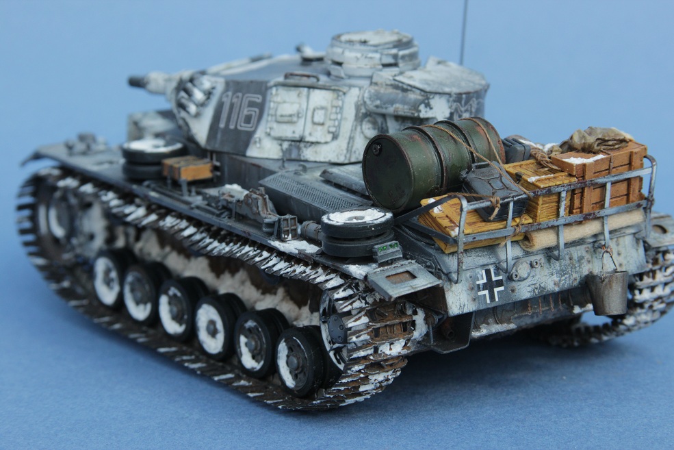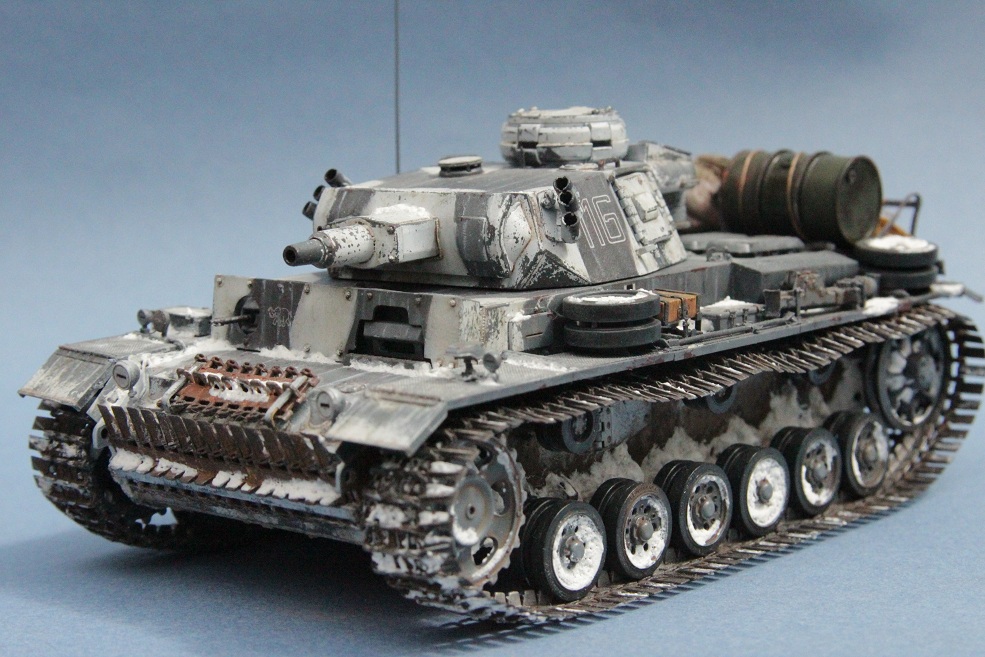 Коллеги, хочу представить третью модель из дружеской стройки это Pz.Kpfw.III Ausf.N от фирмы Dragon. Работа над моделью очень затянулась, аж на два с лишним года… Сам набор довольно хороший и сборка пластика не вызывала затруднений. Но в работе был использован набор фототравление от «ЕТ» вот с ним пришлось повозится. И самое главное, когда модель была собрана и готовилась к покраске, она упала и очень сильно пострадала. Привязку к прототипу я на 100 % не делал, хотя за основу была взята реальная машина. Красил как всегда Тамия, Ганза, фильты маслом, тонировка АК, пигменты АК, и первый раз попробовал готовый снег от W.