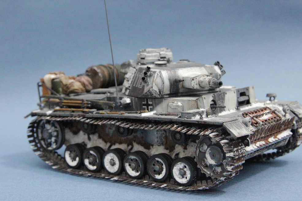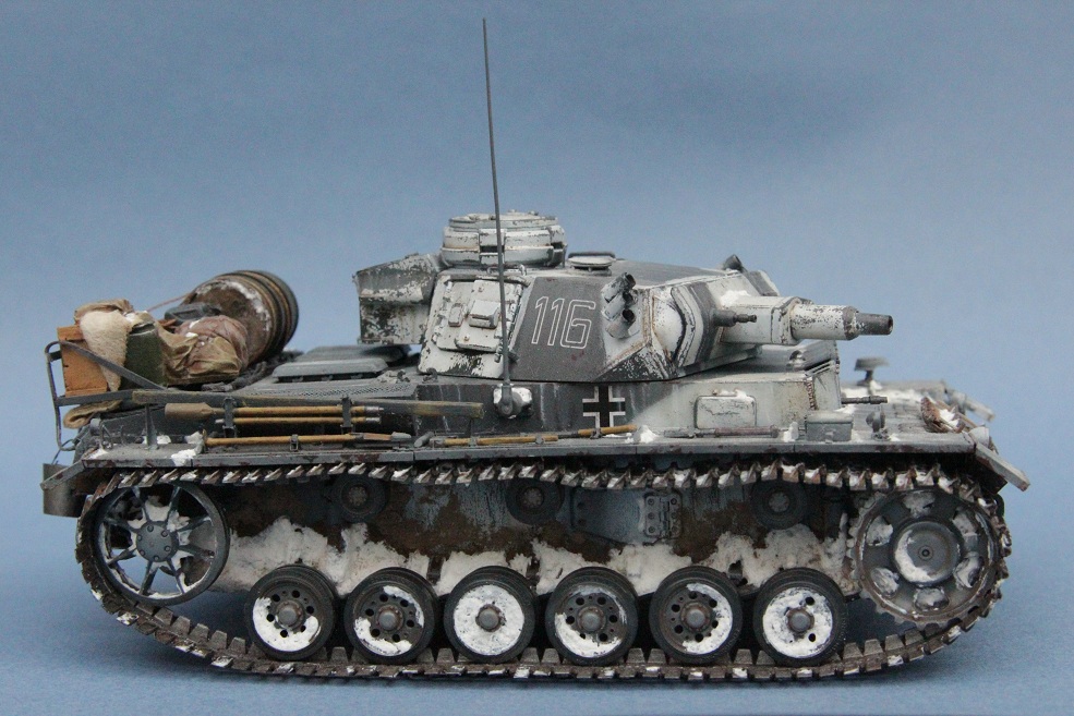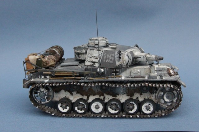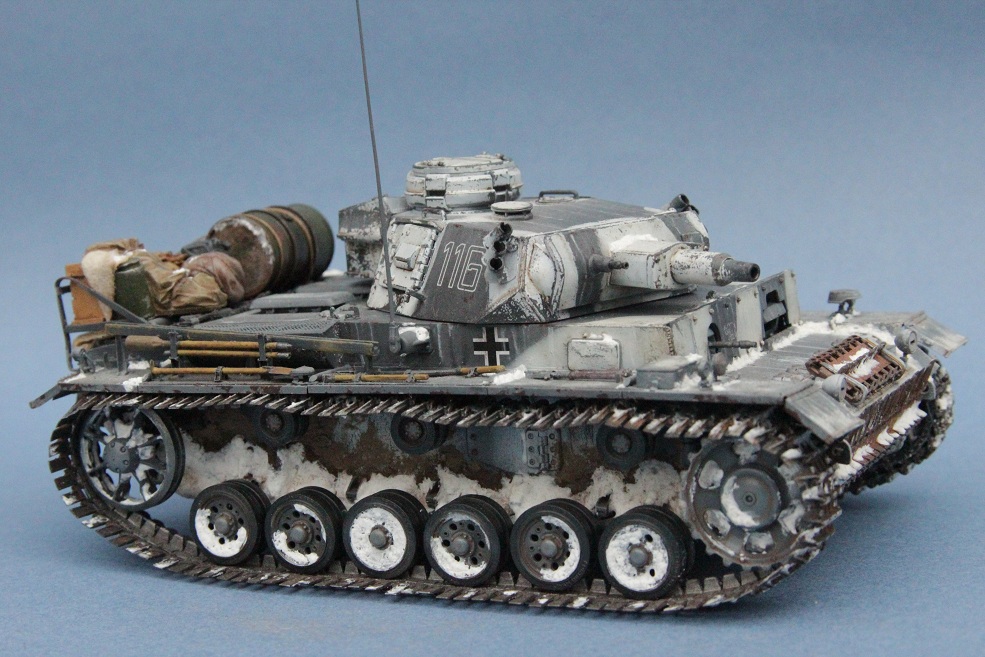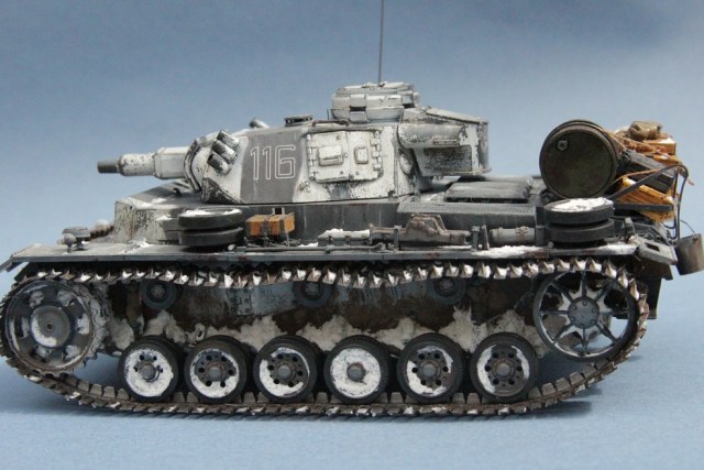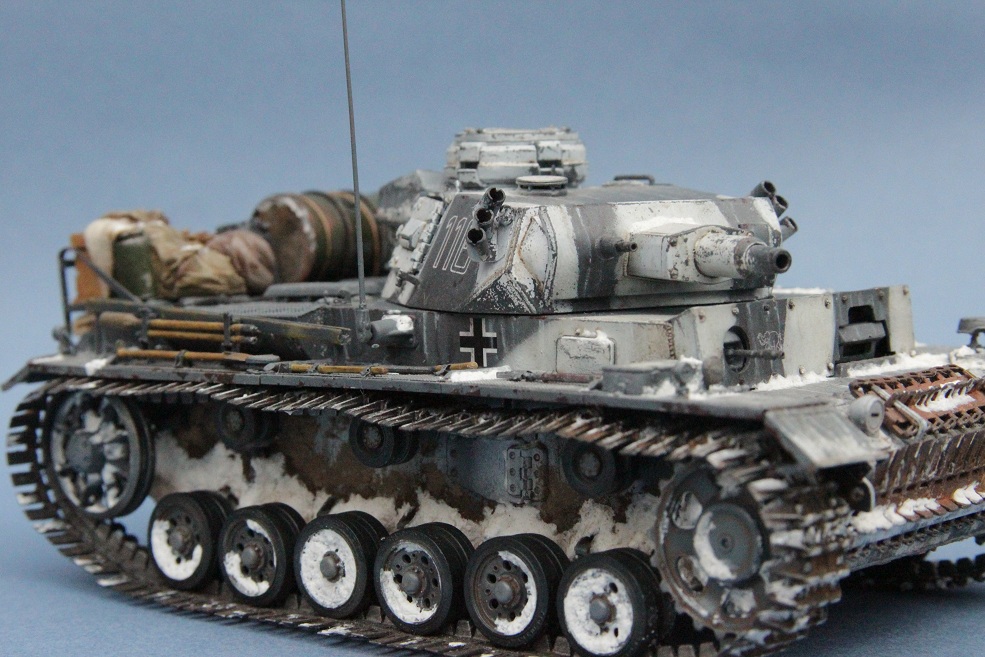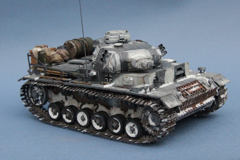 Коллеги, хочу представить третью модель из дружеской стройки это Pz.Kpfw.III Ausf.N от фирмы Dragon. Работа над моделью очень затянулась, аж на два с лишним года… Сам набор довольно хороший и сборка пластика не вызывала затруднений. Но в работе был использован набор фототравление от «ЕТ» вот с ним пришлось повозится. И самое главное, когда модель была собрана и готовилась к покраске, она упала и очень сильно пострадала. Привязку к прототипу я на 100 % не делал, хотя за основу была взята реальная машина. Красил как всегда Тамия, Ганза, фильты маслом, тонировка АК, пигменты АК, и первый раз попробовал готовый снег от W.