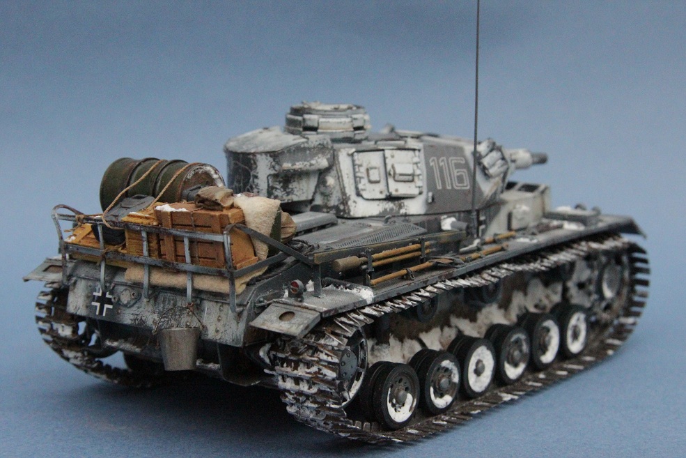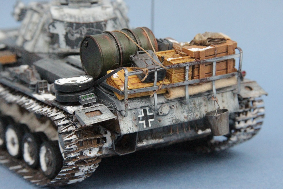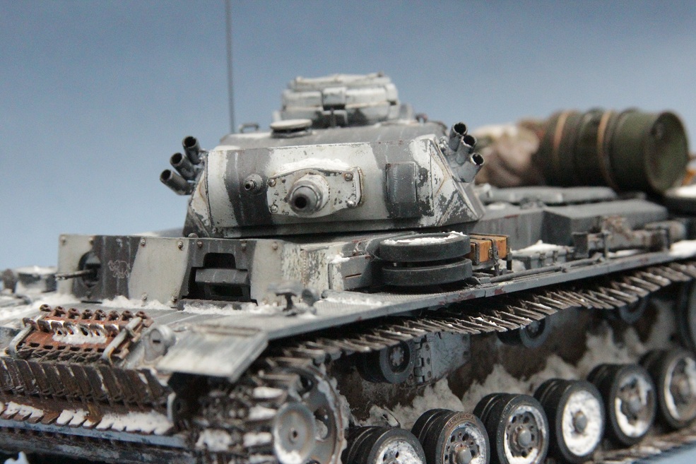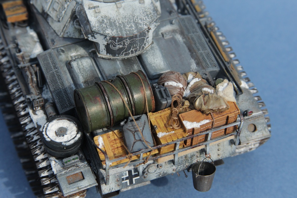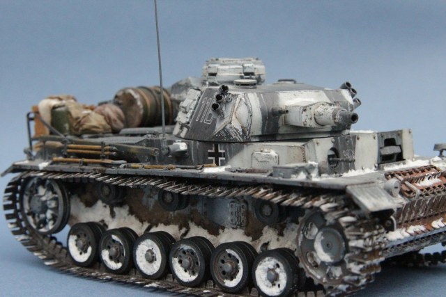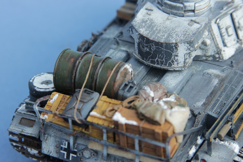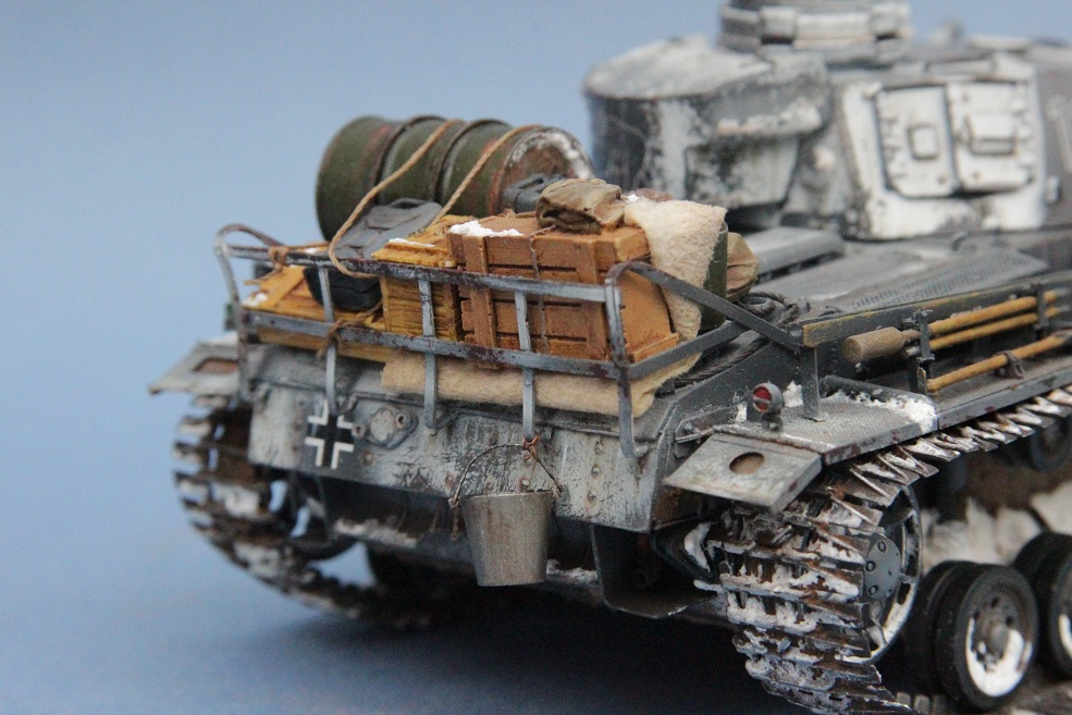 Все круто, только снег какой-то нереалистичный, не вяжется он с моделью. Грязь будто сырая, а поверх нее снег. Нелогично. Лучше бы сделали меньше грязи, или же наоборот изобразили танк весной, но весной такого чистого снега нету, он весь грязный. Плюс на МТО слишком много вещей: танк явно раннего периода войны, а в начале войны у немцев еще не было проблем с транспортом и все вещи возили грузовики. Не понимаю тех, кто обвешивает немецкие танки так, будто это индийский поезд.