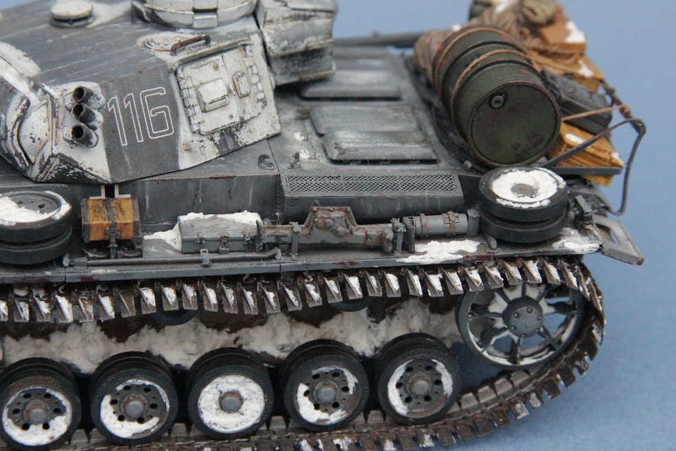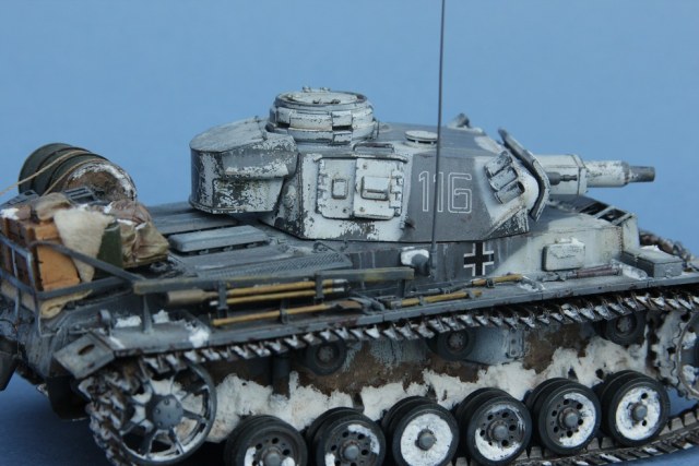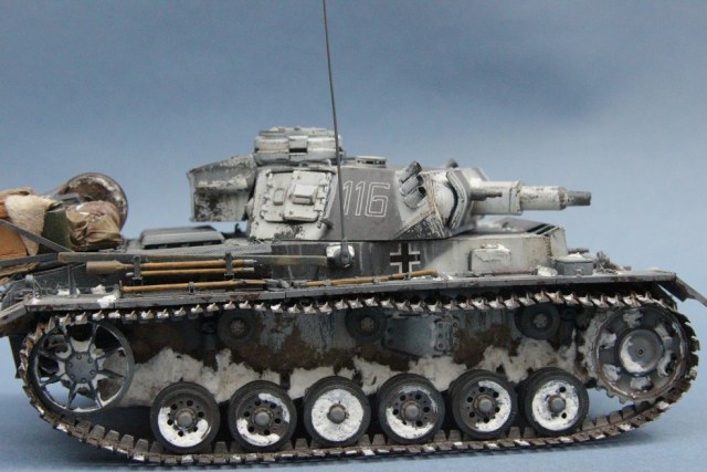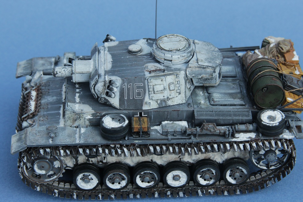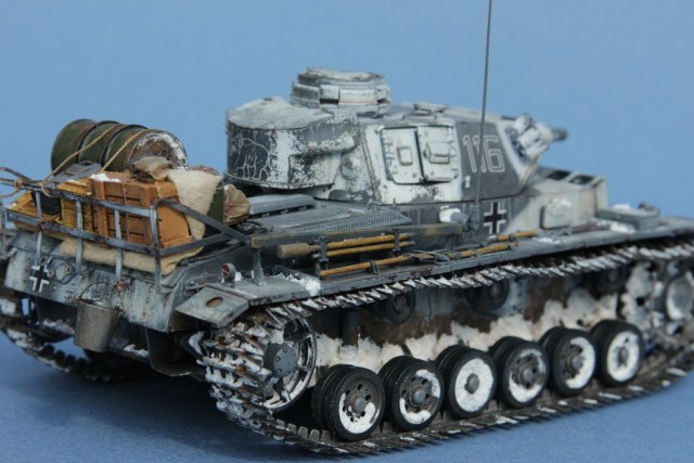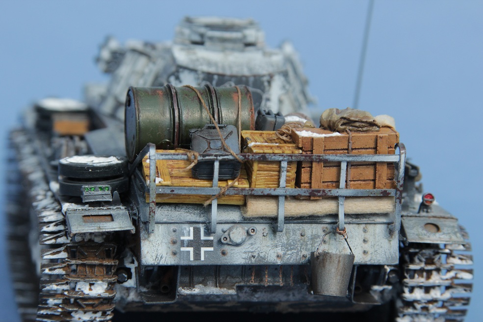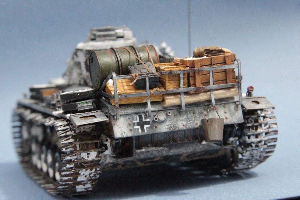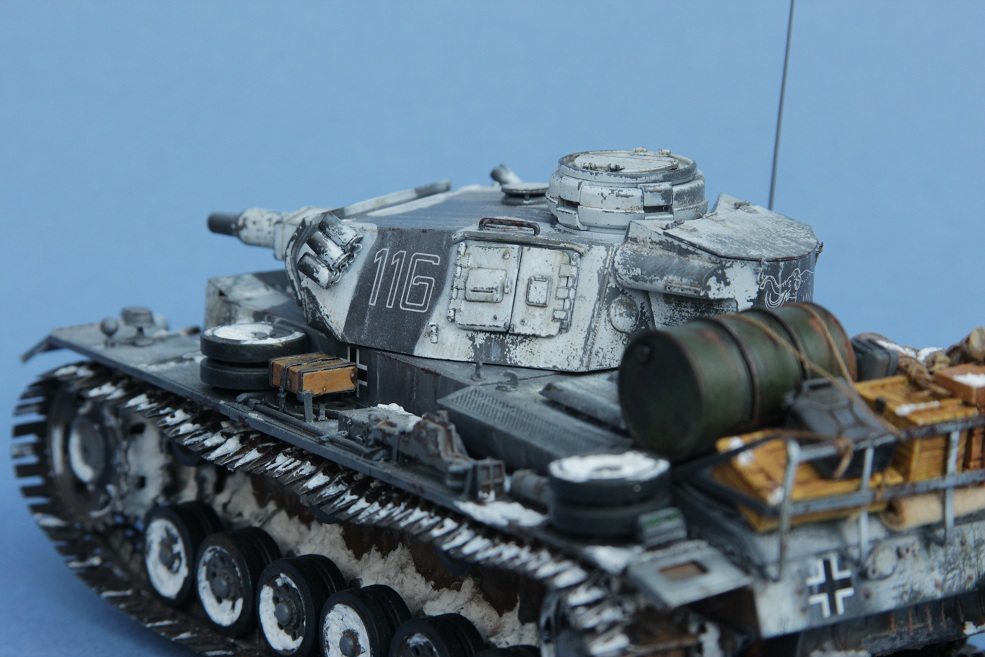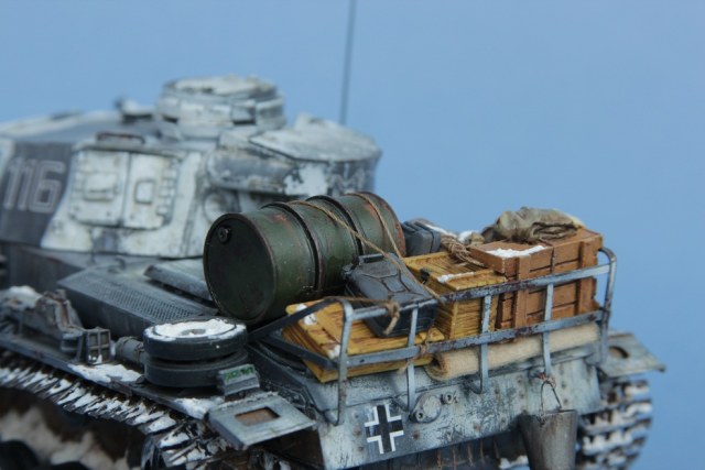 Все круто, только снег какой-то нереалистичный, не вяжется он с моделью. Грязь будто сырая, а поверх нее снег. Нелогично. Лучше бы сделали меньше грязи, или же наоборот изобразили танк весной, но весной такого чистого снега нету, он весь грязный. Плюс на МТО слишком много вещей: танк явно раннего периода войны, а в начале войны у немцев еще не было проблем с транспортом и все вещи возили грузовики. Не понимаю тех, кто обвешивает немецкие танки так, будто это индийский поезд.