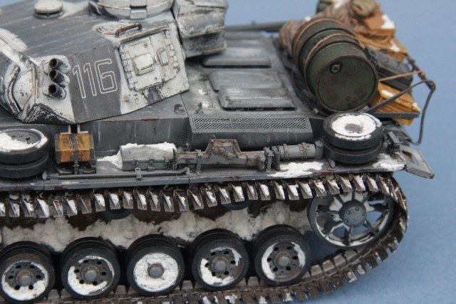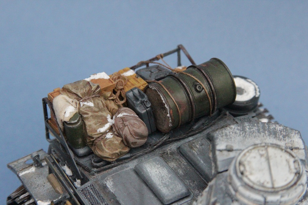 танк был унечтожен в 43 году так что поездить он успел и багажник на танке не просто так наваривали, вещей на танке не так и много ( бывао и больше), цвет грязи ... ну не знаю по мне так она на сырую совсем не похожа. Загрязнение и снег делал по многочисленный фото (образ конечно собирательный но зимние такни с грязной ходовой и налипшим снегом было много)