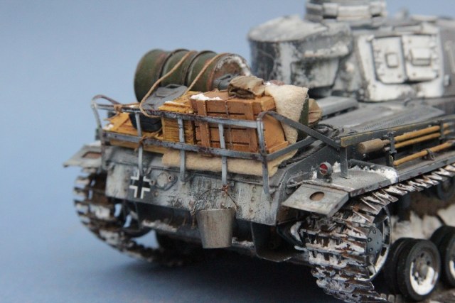 Из того, что не понравилось: грязь на корпусе под снегом - хороша в части нанесения, фактуры, НО - выглядит слишком сухой. Всё-же как-то стоило быть ей потемней и повлажнее. Аналогично - немного выбиваются из общей картины ящики, стоило чуть разнообразить их цвет. Смутило что траки слишком светлые в местах, по которым катятся катки - опять-же, имхо, но стоило темнее цвет выбрать. Это всё конечно на субъективный взгляд, я не утверждаю что так было бы истинно правильно.