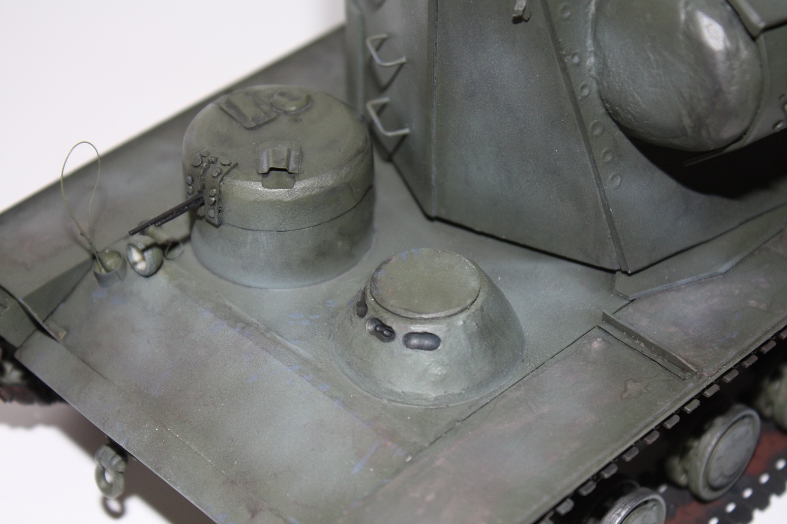 Углы наклона левой сиськи - неверные, видно невооруженным глазом, если сравнить с чертежом. Крюки на башне тоже мелковаты имхо. Заклепки жутко неаккуратные. С окраской совсем все грустно. Работы проделали много, а результат совсем не оправдал затраченного времени и усилий.