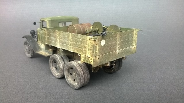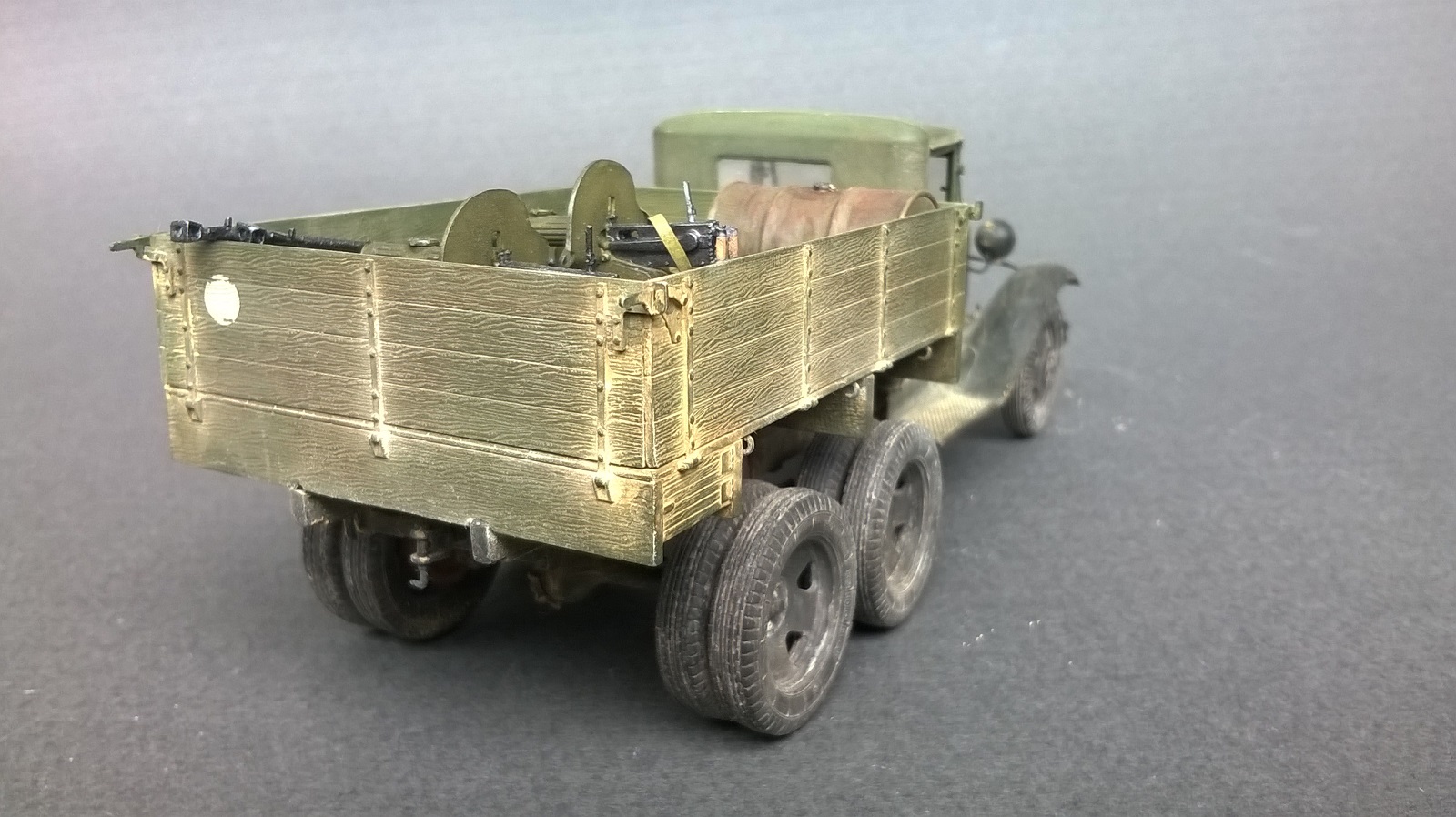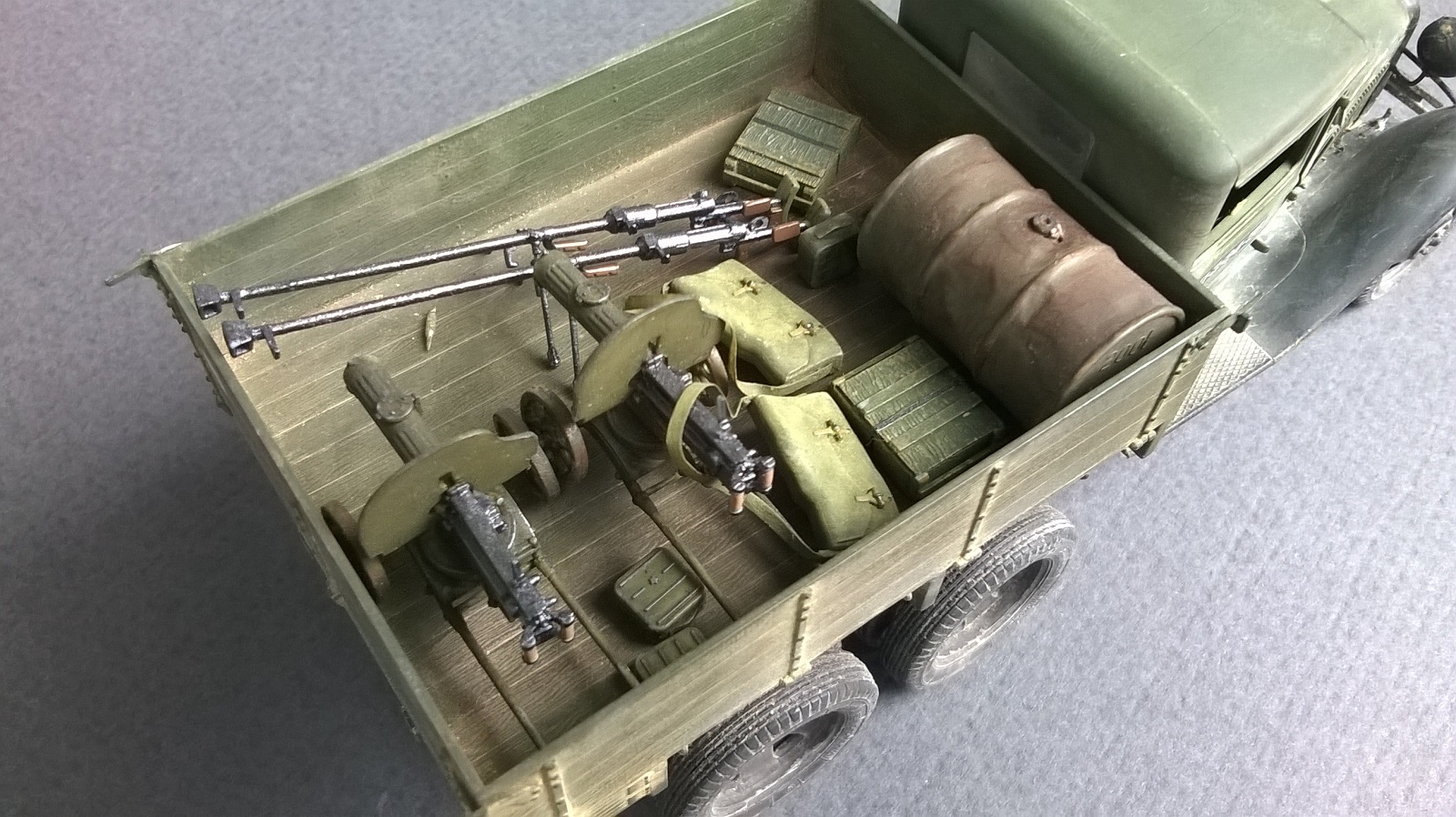по исполнению конечно круто, всего навалом. А мне вот не нравится, неестественно все, слишком нарочито. И в кузове... ну не бывает так, чтоб наваливали в кузов бочек, стволы и прочее. Все же разобьется и поломается в дороге. По мне, если оживлять кузов, так натурально, ящики поставить под брезент, или бочками заставить...