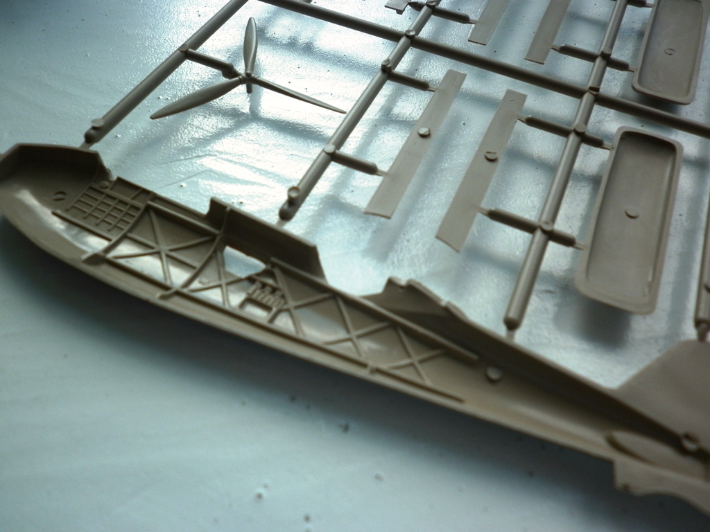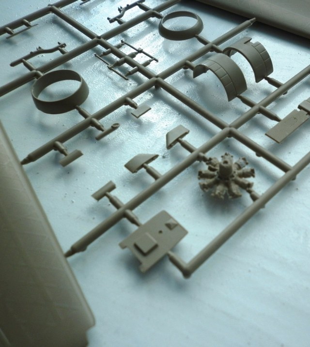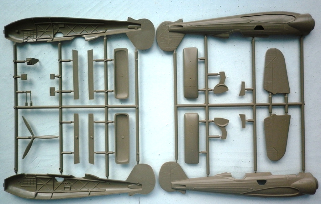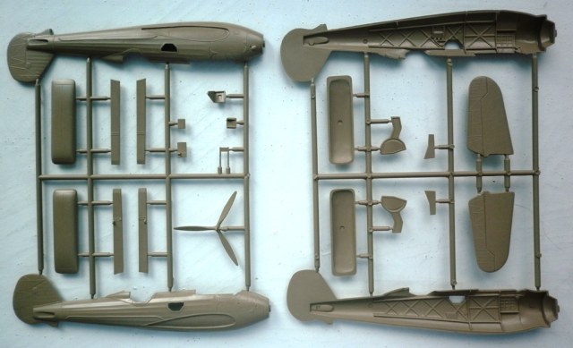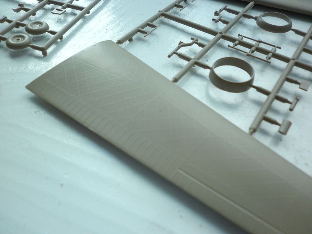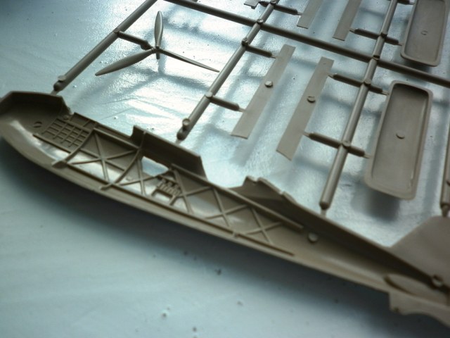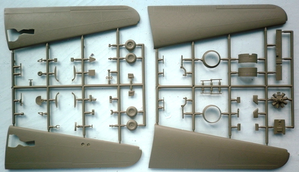 Пластик .... Литьё чёткое , без дефектов . Деталировка неплохая , отлично передан интерьер фюзеляжа , впрочем , 75% этого богатства после сборки видно не будет. А видно будет что структура силового набора на крыле пропадёт уже после покрытия слоем грунта. Настолько она "деликатная".