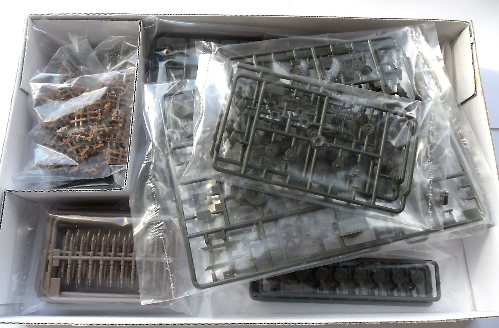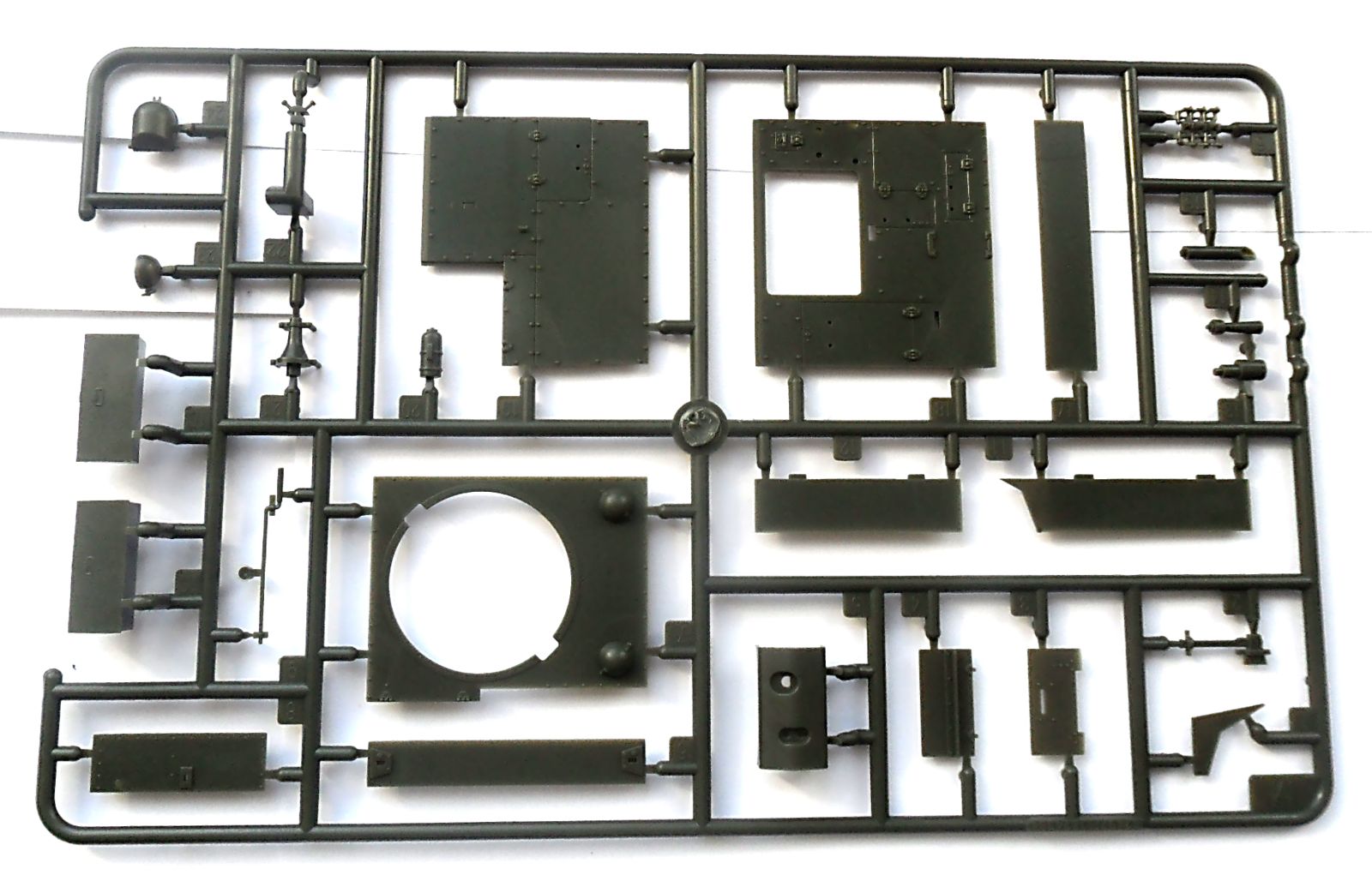 Модель упакована в стандартную "хоббибоссовскую" коробку. В коробке имеются: 13 литников с деталями машины, ванна корпуса, набор сборных траков с пальцами, литник со стеклом фары, две небольшие платы фототравления, скромная декаль, инструкция и образцы окраски.