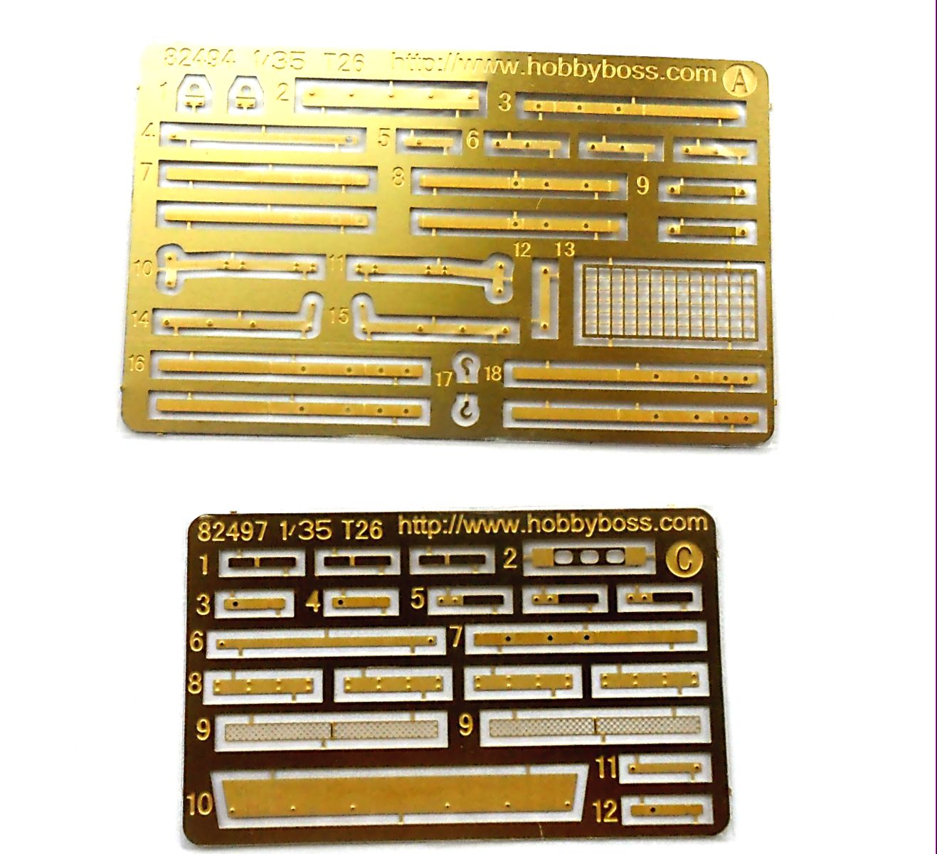 К стандартному набору травления дана еще одна платка (судя по надписи из набора Т-26 38 г., № 83497), на которой даны крепления цепи на корме и кронштейн крепления запасных траков на ВКД, что интересно, то такого кронштейна нет в выпущенных наборах травла от "Вояджера" и "ЕТ Модел".