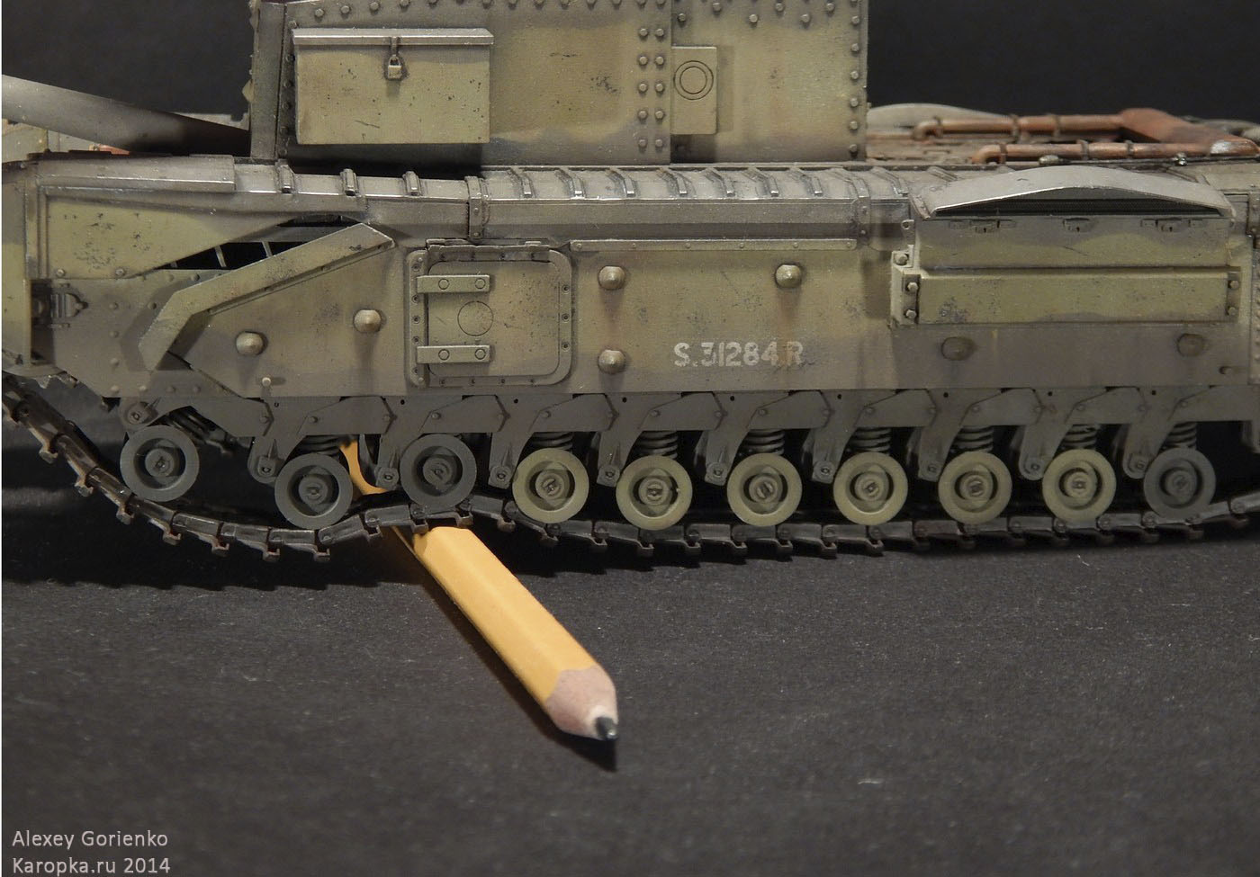 При постройке этого сундука практически не возникло проблем, единственное - опечатка в инструкции при сборке ходовой, которой грешат все Черчилли этой фирмы. И пришлось "подкрутить" крепление орудия, потому что оно слишком свободно болталось в амбразуре. Ну и местами мешала гипер-детализация. Резиновые гусеницы заменил на наборные, между прочим отличного качества. Больше замечаний по сборке нет, доработок тоже нет - изкоробочная сборка.
