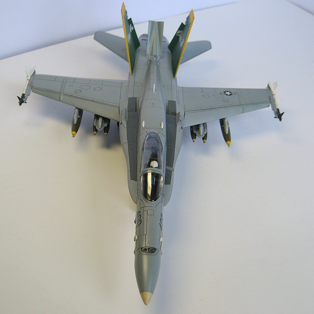 И вновь здравствуйте. На этот раз предлагаю вашему вниманию старую модель от Хаси - F-18C. Модель с замыленной расшивкой, с ужасной собираемостью, и без воздушных каналов В\З. Расшивку - дорезал, точнее сказать - полностью перекроил, с каналами не стал заморачиваться, шпаклевки - не пожалел. Раскроил механику крыла, ну и собственно все.К сожалению , деколи , очевидно от долгого хранения пересохли , и при намокании пошли трещинами, пришлось сушить и покрывать по верху лаком, только после этого удалось сложить пазл. Но некоторые мелкие элементы все равно испортились и пришлось подыскивать замену из обрезков от других наборов.Поэтому можно доглядеться, что некоторые элементы ( не называю какие) не совсем соответствуют оригиналу. Поэтому модель можно назвать - по мотивам. краска традиционно- эмали Humbrul Yu127, 128, Немного цветных- зеленый , желтый, конечно футура, финишнее покрытие матовый авто - лак из балончика предварительно сцеженный и задутый аэром по слою футуры. Везиринг наносить не стал, ограничился смывкой- в бензине "калоша" немного развел темно серой краски.
