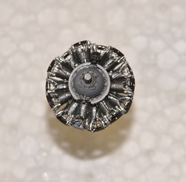 Далее, ожидая прихода травления, работал с двигателем. Проработка деталей очень подробная, но некоторыми пришлось пожертвовать. Чтобы облегчить себе монтаж двигателя внутри капота, я принял решение отрезать часть основной детали движка, сразу после 2-ого ряда цилиндров. Таким образом, работы по двигателю упростились – монтировать выпускные патрубки из цилиндров теперь не нужно. В остальном собрал двигатель в одно целое в соответствии с инструкцией, сделав толкатели цилиндров из пластиковых прутков D=0,5 мм и свечную проводку из проволоки 0,2 мм. Умаялся порядком, но вид собранного двигателя меня порадовал – с ним стоило повозиться.