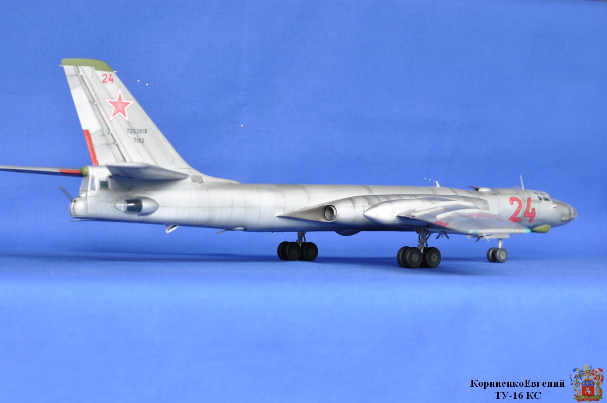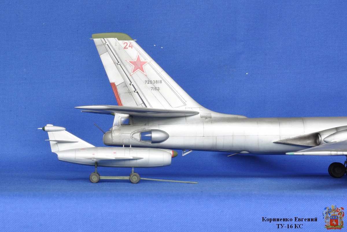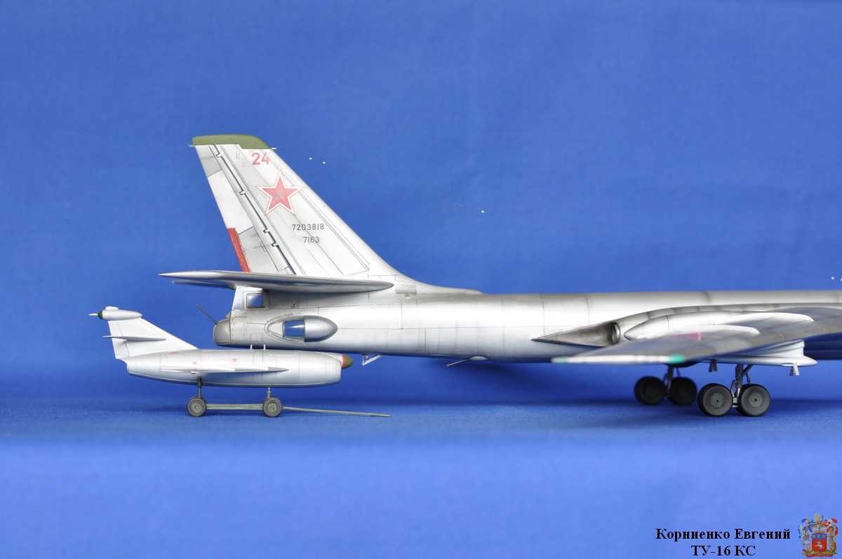 Собирал я эту модель почти полтора года, причин тому было много, то надоедал, то ломался аэр, то звезды светили не так...... Вообщем стройка вот здесь http://karopka.ru/forum/forum189/topic14710/ Взял за основу ТУ-16 К-10. Были приобретены 2 ракеты КС от А-модел. Смоляные воздухозаборники , сопла и законцовка крыла (заправочная) от НеОмега. По жадничал и не стал брать колеса от Экипажа, о чем жалею. Взял травление на колеса.