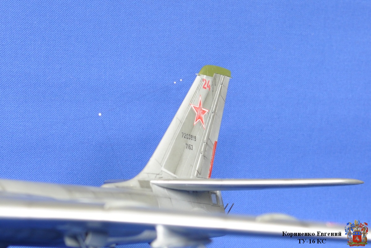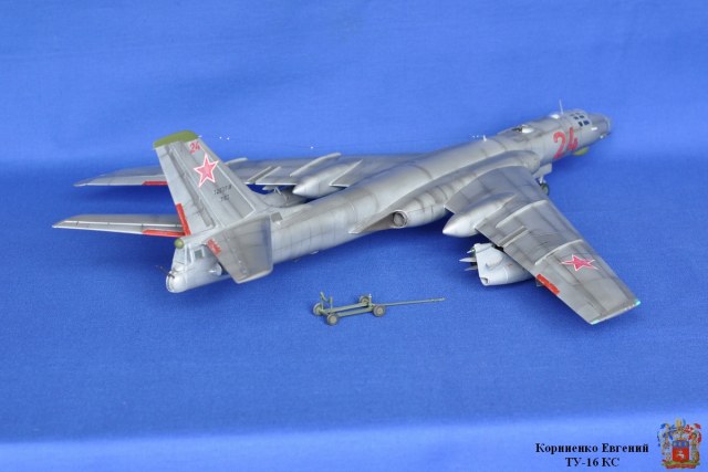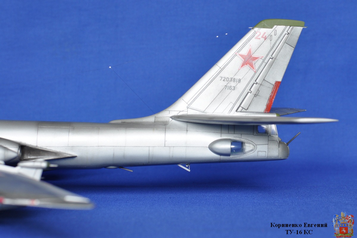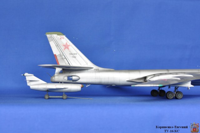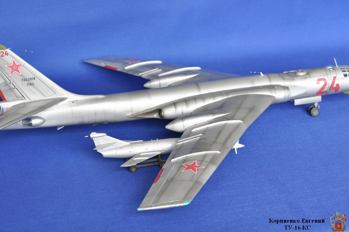 Собирал я эту модель почти полтора года, причин тому было много, то надоедал, то ломался аэр, то звезды светили не так...... Вообщем стройка вот здесь http://karopka.ru/forum/forum189/topic14710/ Взял за основу ТУ-16 К-10. Были приобретены 2 ракеты КС от А-модел. Смоляные воздухозаборники , сопла и законцовка крыла (заправочная) от НеОмега. По жадничал и не стал брать колеса от Экипажа, о чем жалею. Взял травление на колеса.