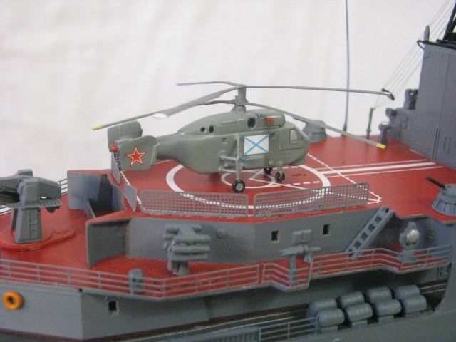Замечания по окраске и антеннам уже прозвучали. От себя добавлю почему при том что корабль несет флаги Советского ВМФ на корабельном вертолете изображен Андреевский флаг?