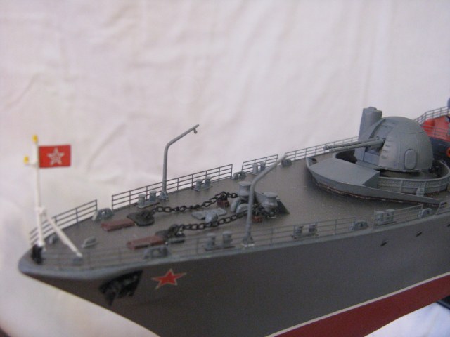 По детализации: штыревые антенны на надстройке слишком толстые, флагштоки так же. Кран-балки на носу - где их обвязка? То же касается и топливного устройства в середине корабля (штанга гнутая такая). Скобтрапы на орудийных башнях и шланги охлаждения на стволах? Почему бортовые иллюминаторы в цвет корпуса? Спасательные круги вроде как в красный у нас красят, а не в оранжевый.