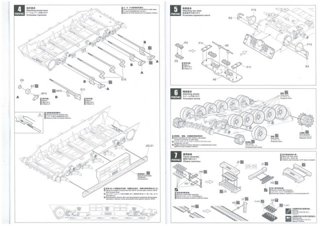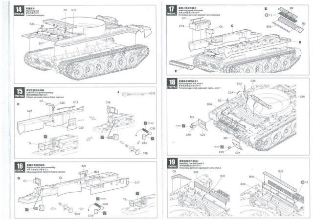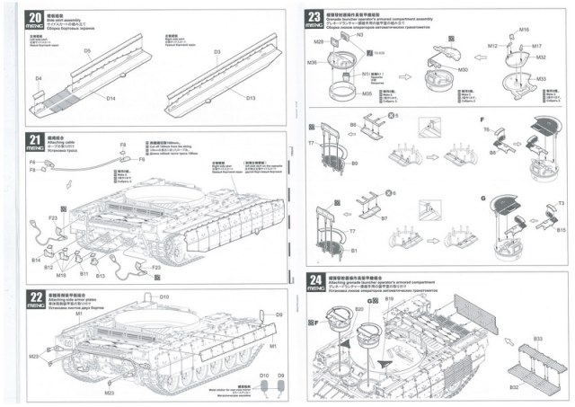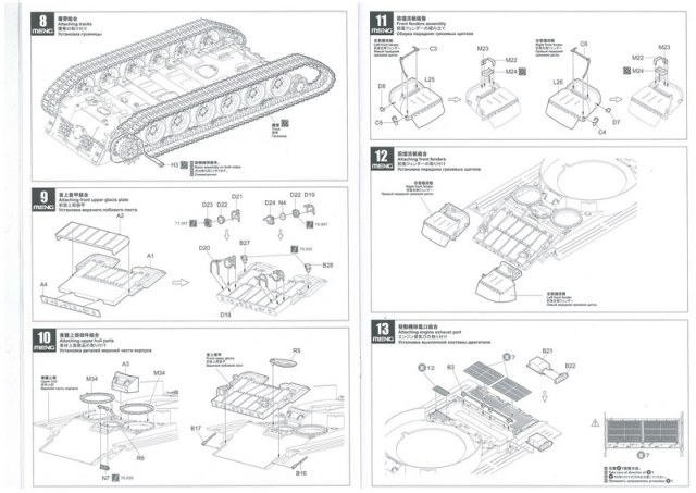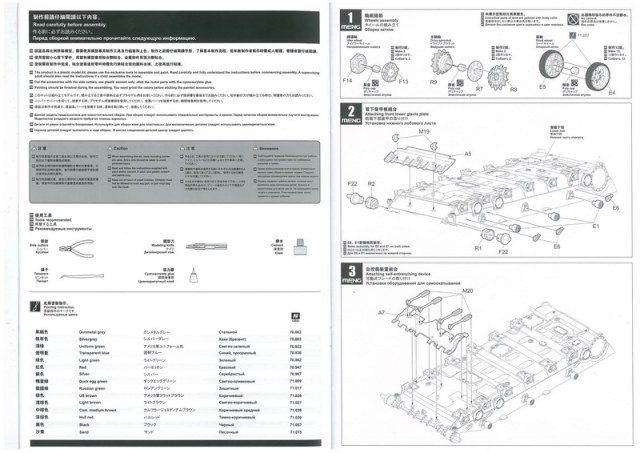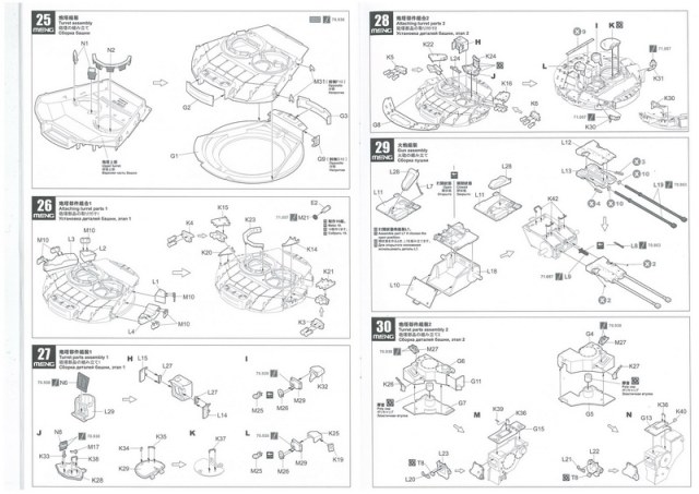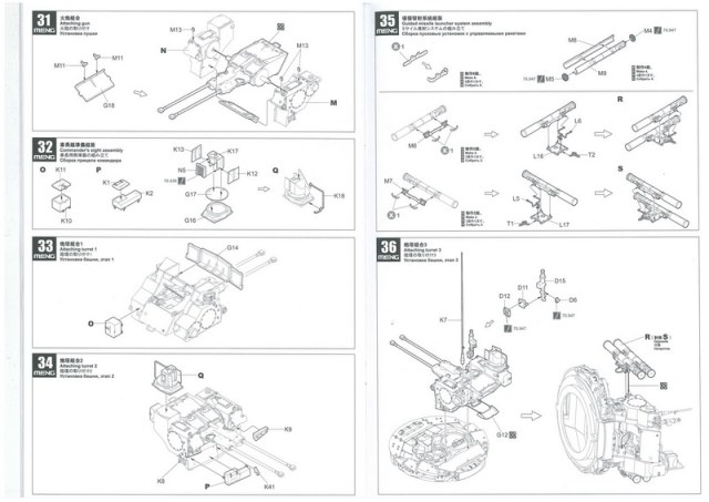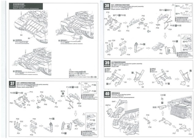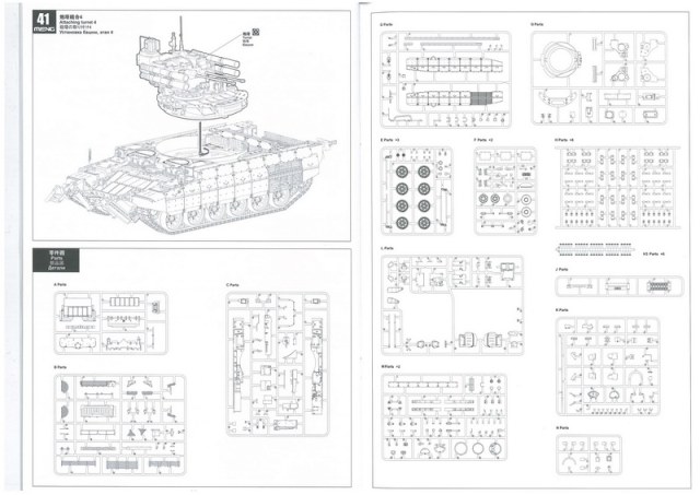Инструкция, в виде книжки на 30 листах. Дана краткая история создания БМПТ с чего всё начиналось, на четырёх языках, также все пояснения по сборке даны на четырёх языках включая пояснения на русском. И несколько страниц с рисунками общего количества литников с деталями.