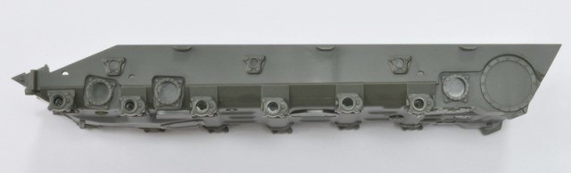 На втором фото я показал станочек для того чтобы зафиксировать подвеску в нужном положении как и положено если машина стоит, так вот если подвеску не зафиксировать, то она просаживает в низ по сравнению с фиксацией по станку т.е. по простому пластик деталей 10 и 11 не выдерживает нагрузки и незначительно но проседает, а в связи с этим кажется, что машина сидит ниже чем положено если одеть бортовые экраны. Этот же эффект наблюдался и у Менговского Т-90 на некоторых форумах по моему Панцер 35 (точно не помню) это было показано наглядно, у самого стоит 90 с наполовину закрытыми катками, поэтому либо надо менять на проволоку либо фиксировать не зря же они такой станочек положили.
