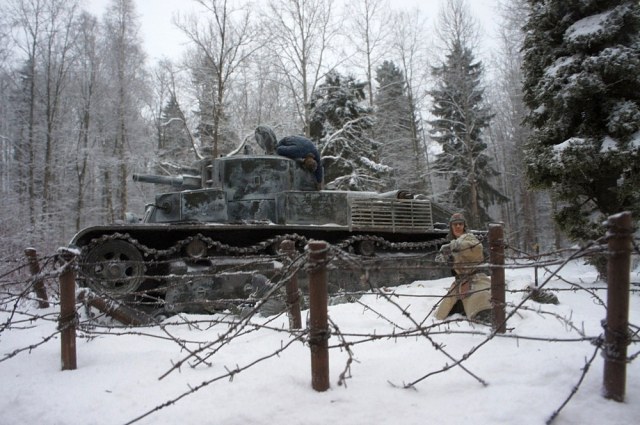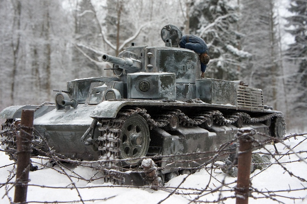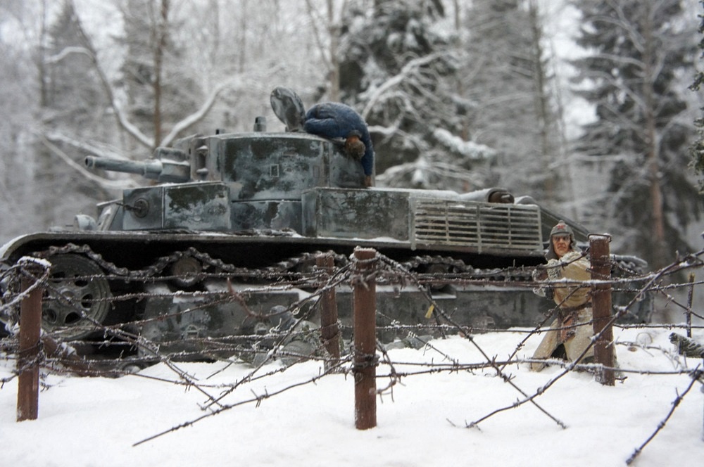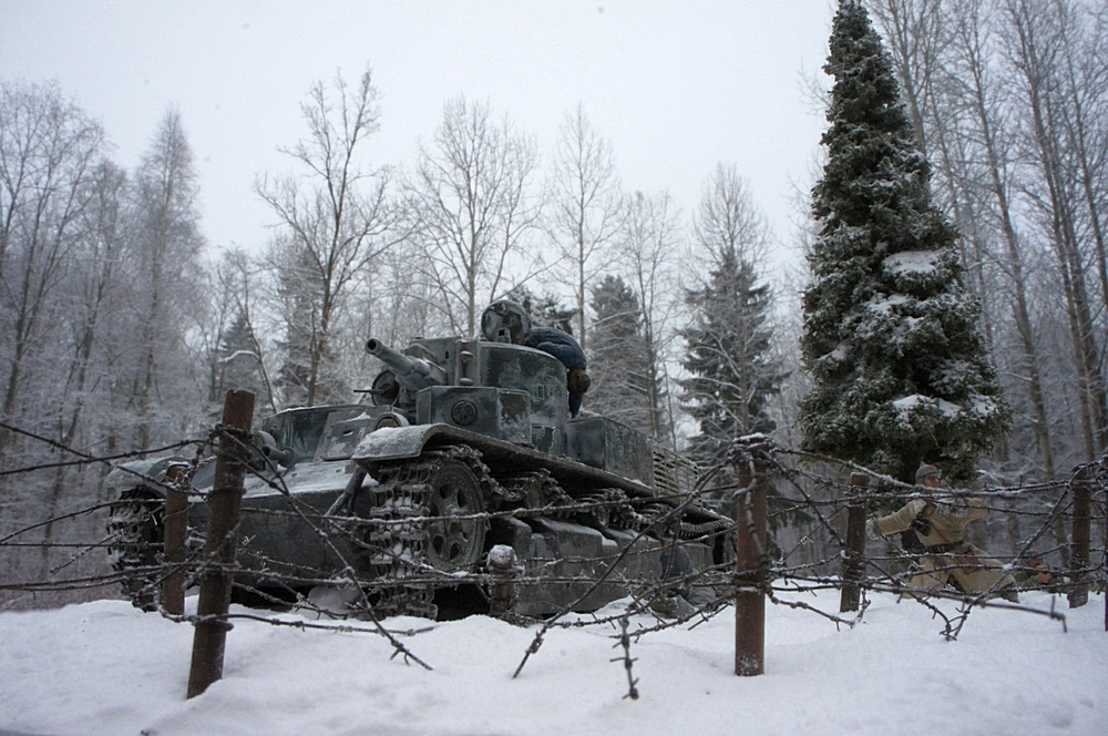 Подразумевалось, что танк получил повреждения гусеницы. Например от ПТР. В дальнейшем экипаж танк пробовал покинуть, из-за чего на башне убитый танкист. События на диораме вполне могли происходить и через некоторое время. В районе Сумма-Хотинен шли затяжные бои.[/QUOTE]