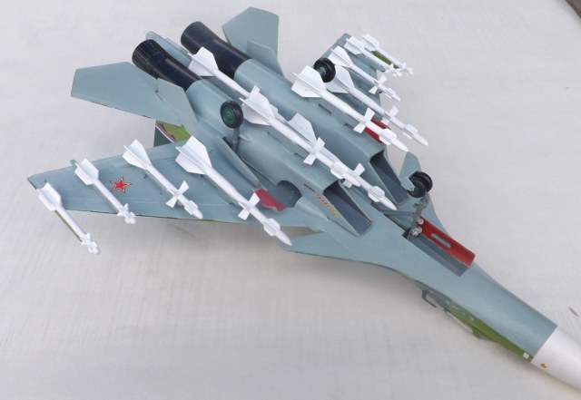 Влад, вооружение слишком уж по-игрушечному смотрится. Оперение конечно нужно утачивать, и не "заливать по тупому" все в белый цвет. Ракеты они весьма пестрые, с кучей технических надписей. Да и не думаю, что реальные самолеты так обвешивают "по максимуму". У Вас, видимо, все что шло в наборе под крылья и брюхо пошло. :-))))