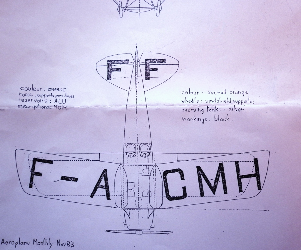Остальная схема окраски описана на французском и на английском - оранжевый аэроплан с чёрными кодами и серебристыми межкрыльевыми стойками, баками и колёсами