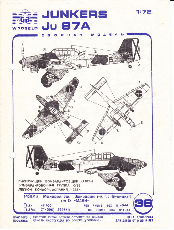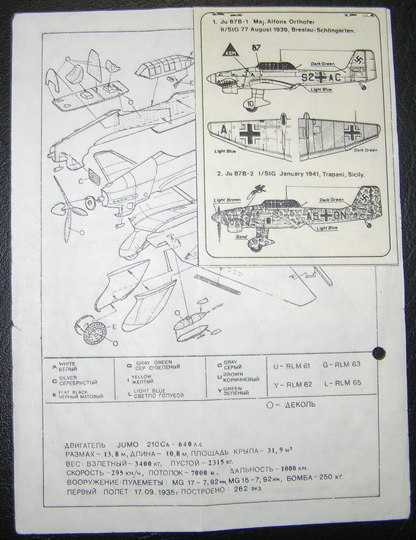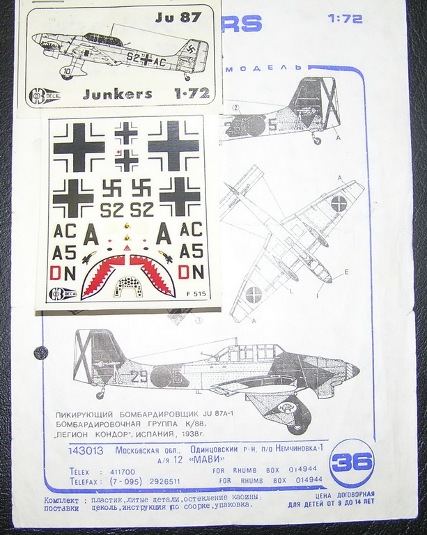 - лепесток инструкции: двухсторонний лист формата А-5 со схемой сборки и окраски ("Легион Кондор", Испания, 1938г.);