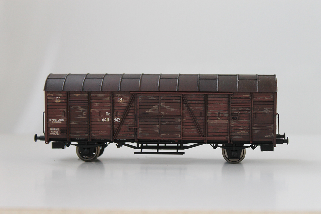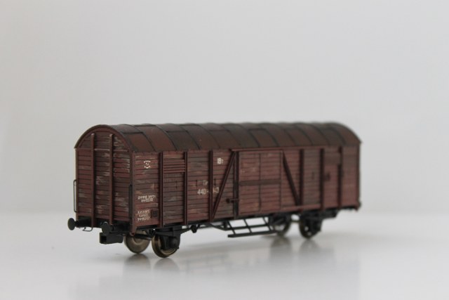 Трофейный, бывший немецкий, крытый вагон, тип Дрезден попавший в Россию после ВОВ. Донором послужил вагон производства фирмы Roco в масштабе 1/87.
