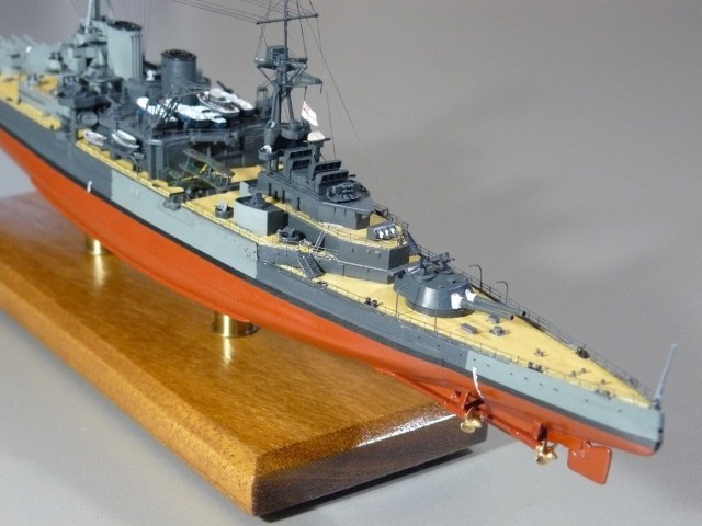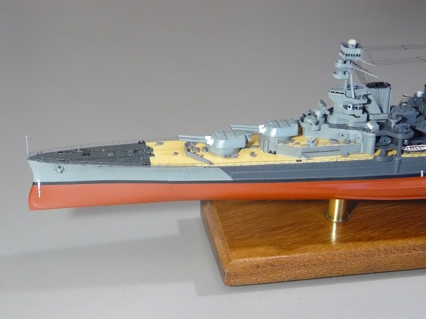 НАДСТРОЙКИ - Конфигурация кормовой надстройки в районе площадок универсальной артиллерии далека от правды, но исправлять не стал. Срезаны фальшборты, мачты частично заменены на проволочные, дополнены дымовые трубы, рассверлены стволы ГК, СК и универсальных 102мм орудий. Перепилен носовой мостик в районе боевой рубки. На стволах ГК имитировал парусиновые кожухи для уплотнения амбразур башен. Леера самодельные паянные из проволоки 0,1мм. Антенны и растяжки - из чулочной нити. Шлюпбалки и краны - из проволоки. В виду случайной утери деталей, "Валрос" сделан "с нуля".