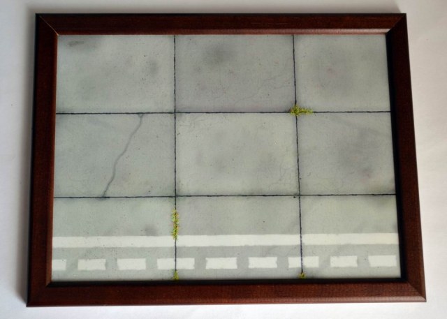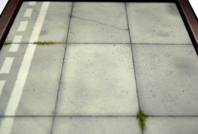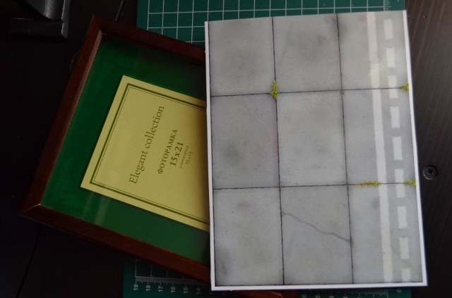 Для зрелищности подарка сделана подставка - фрагмент ВПП. Материалы: фото рамка, фотография полосы. Фото с теснением по стыкам "плит", присыпано землей, скреплено и покрыто матовым лаком. В нескольких местах на ПВА приклеена "трава".