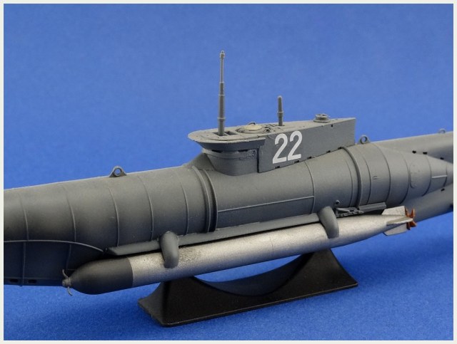 Полностью "изкоробочый вариант".... Ата-та надо по.... Сварные швы - ужас... надо было бы шкурочкой "погладить"... "Изкоробочная" рубка, не верная. Корма - не верная, модель делалась по чертежам трофейной лодки, хранящейся во французском музее, проходившей модернизацию во французском флоте. Отсутствует прозрачный колпак на рубочном люке. В общем... Три с минусом