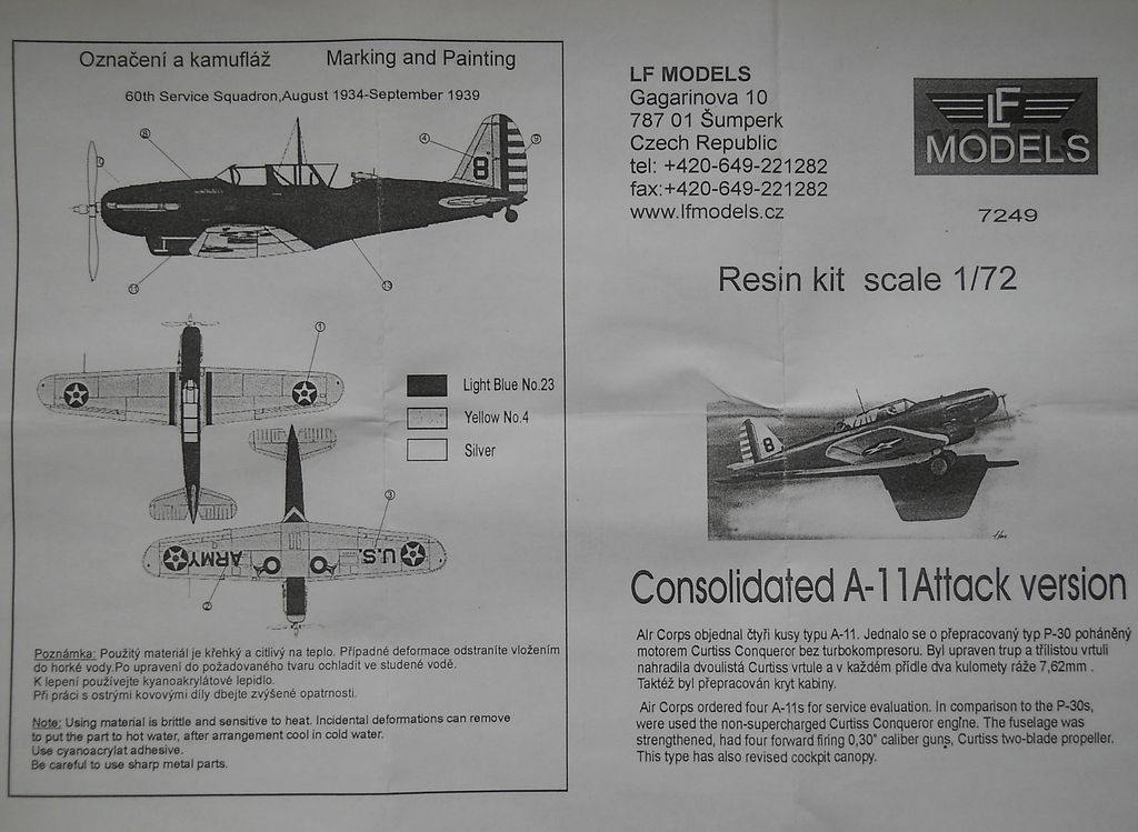 Модель из смолы от фирмы LF Models в масштабе 1/72 (номер по каталогу 7249) упакована в картонную коробку (12х11х3см) с верхним открытием. Неплохое литьё с довольно подробной деталировкой. Имеются пузыри в небольшом количестве. Ваку-фонарь приемлемого качества. Присутствует небольшая плата фототравления. Декали выглядят весьма хорошо. Инструкция вполне наглядна, правда отсутствует информация по окраске интерьера.