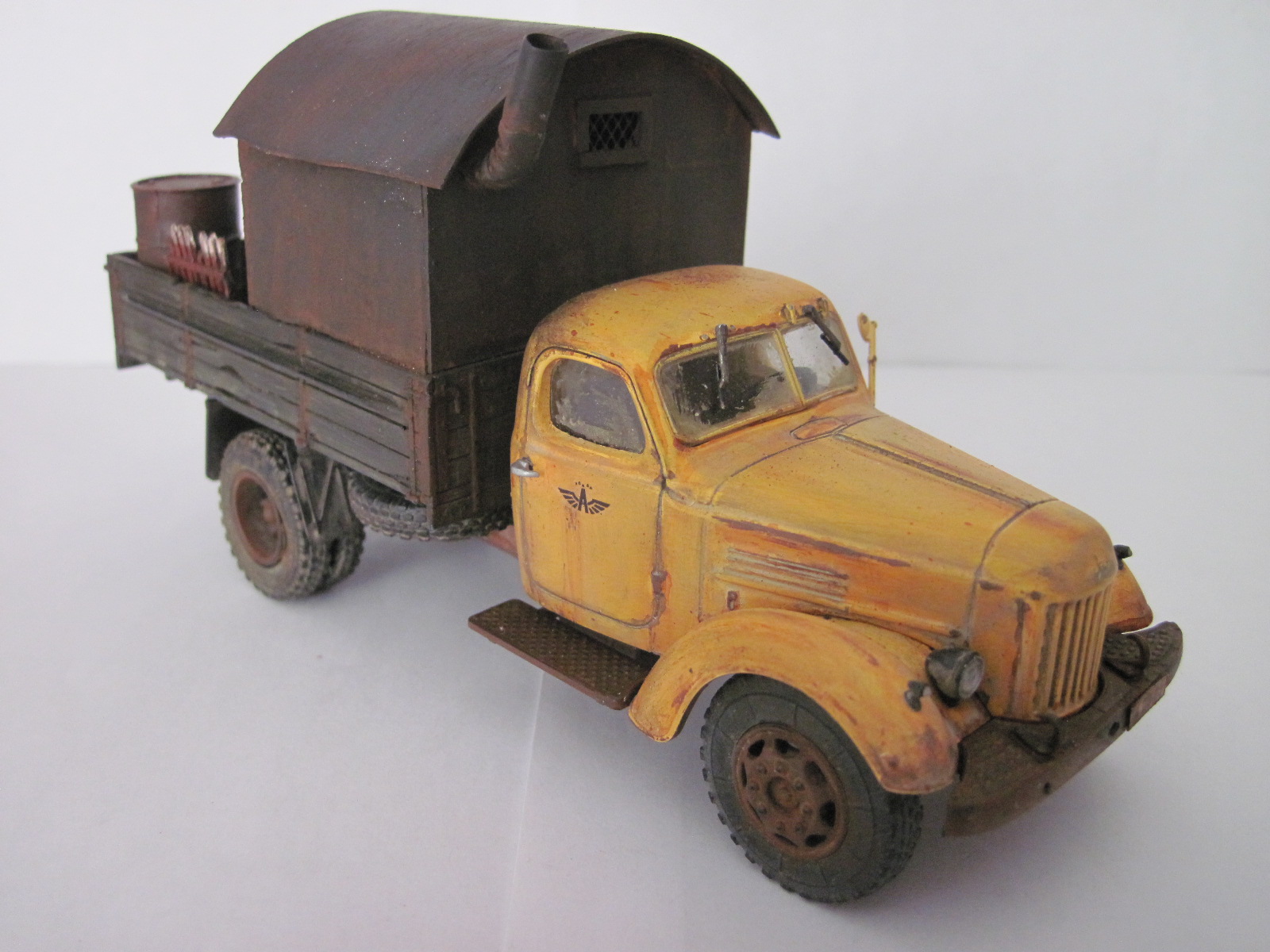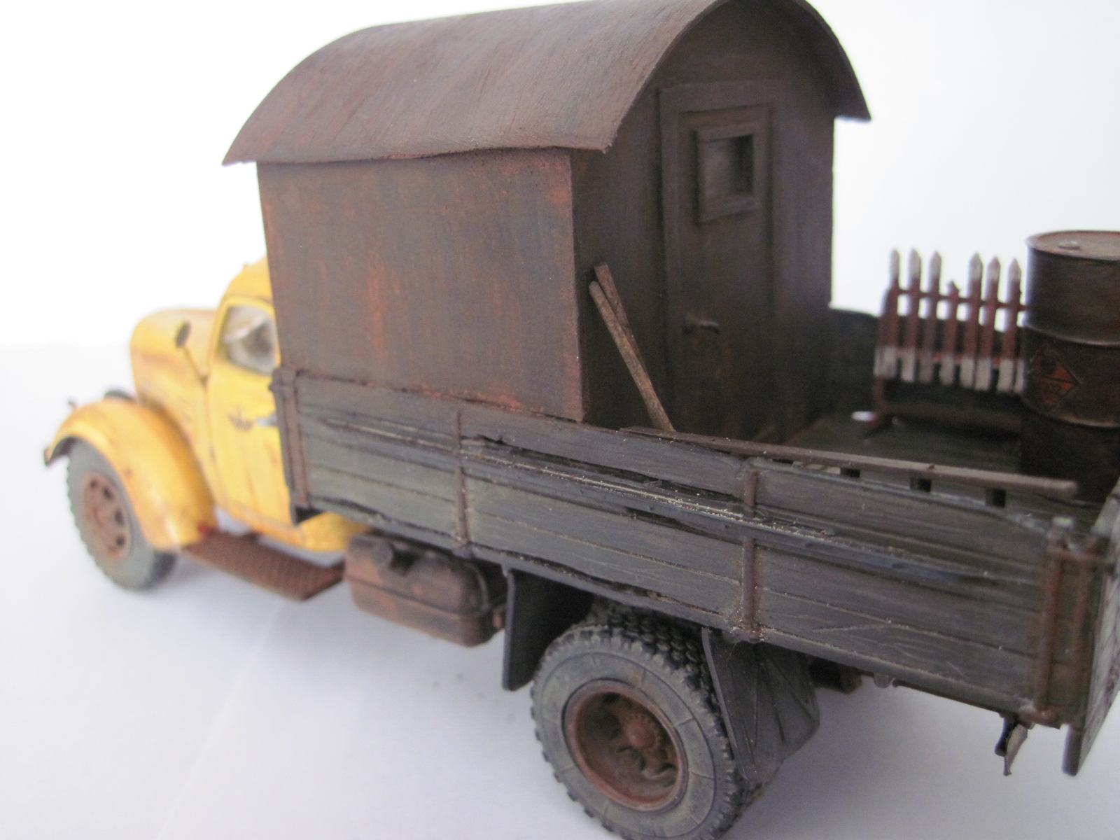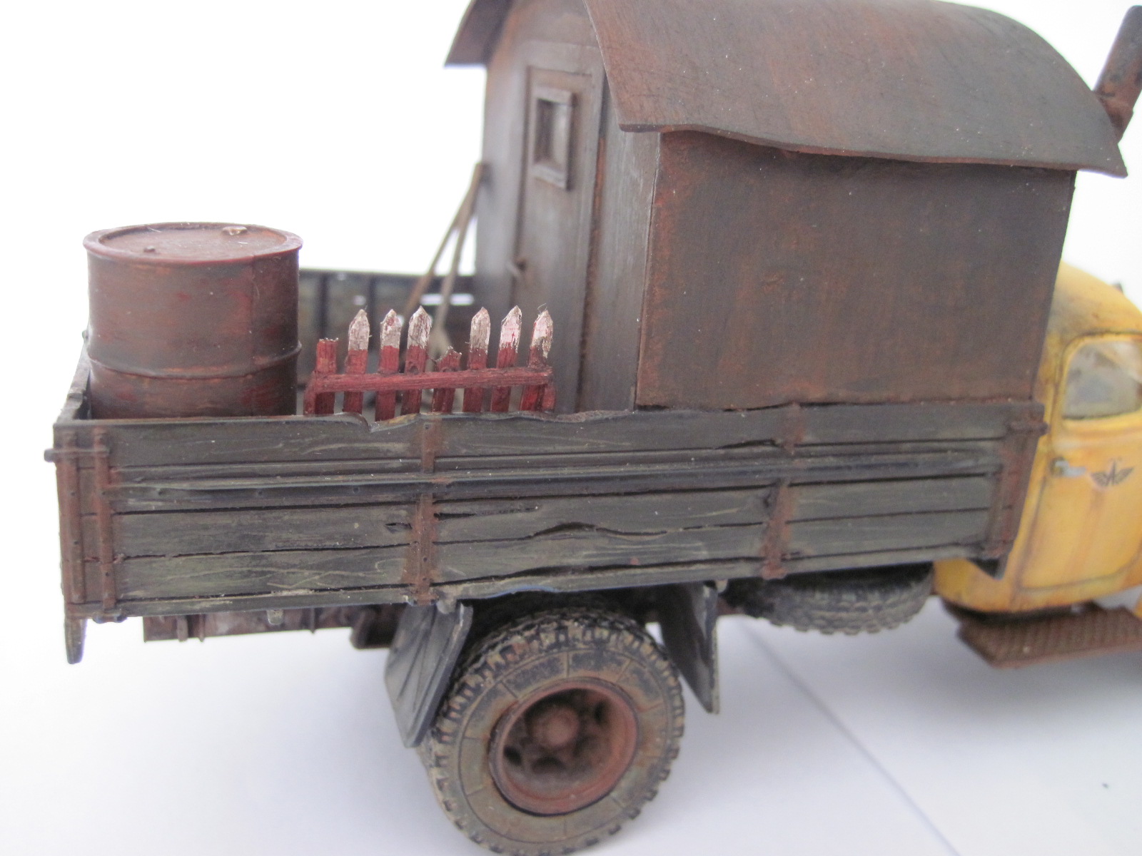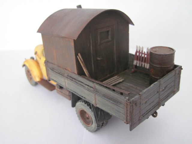 Не похоже на железо, скорее на дерево. Как кузов оттонирован нравится. С кабиной грубовато получилось, в частности сколы- они огромны, а сам цвет кабины как новенький. Грязь/пыль на ходовке понравились. Фото шумные какие то, что здесь, что у предыдущей работы.