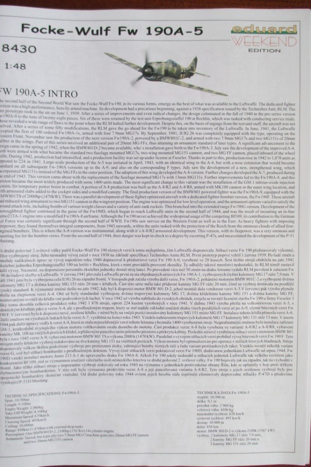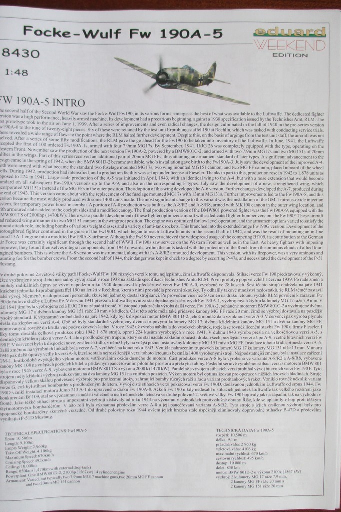 Всем привет. Представляю обзор немецкого истребителя ВМВ Fw 190A-5 фирмы Eduard (кат.№8430). Набор в комплектации weekend edition (отсутствуют маски и фототравление).