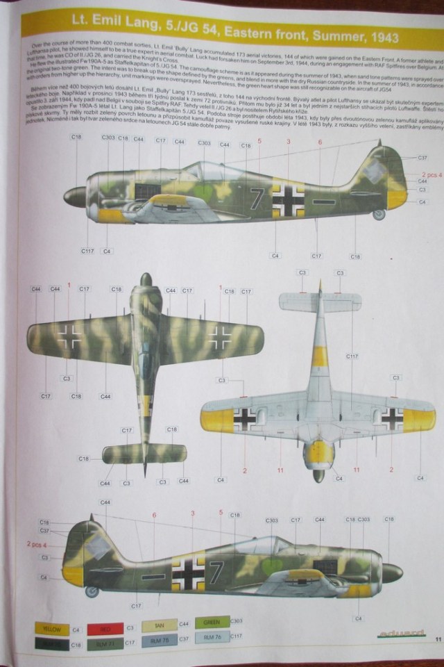 Инструкция-3 листа А3 сложенные книжкой. Напечатана хорошо и понятно что куда клеить. Дана 1 схема окраски для самолета Эмиля Ланга, Восточный фронт лето 1943г. На последней странице показана продукция фирмы Eduard.