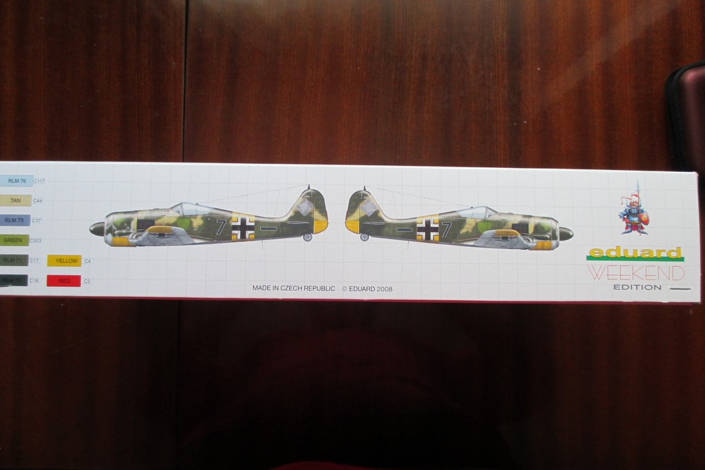 Коробка из плотного картона с верхней загрузкой. На лицевой части изображен Fw 190A-5 б/н "черная 7"в полете. На торце показаны боковики самолета и номера краски по каталогу Mr.Color.