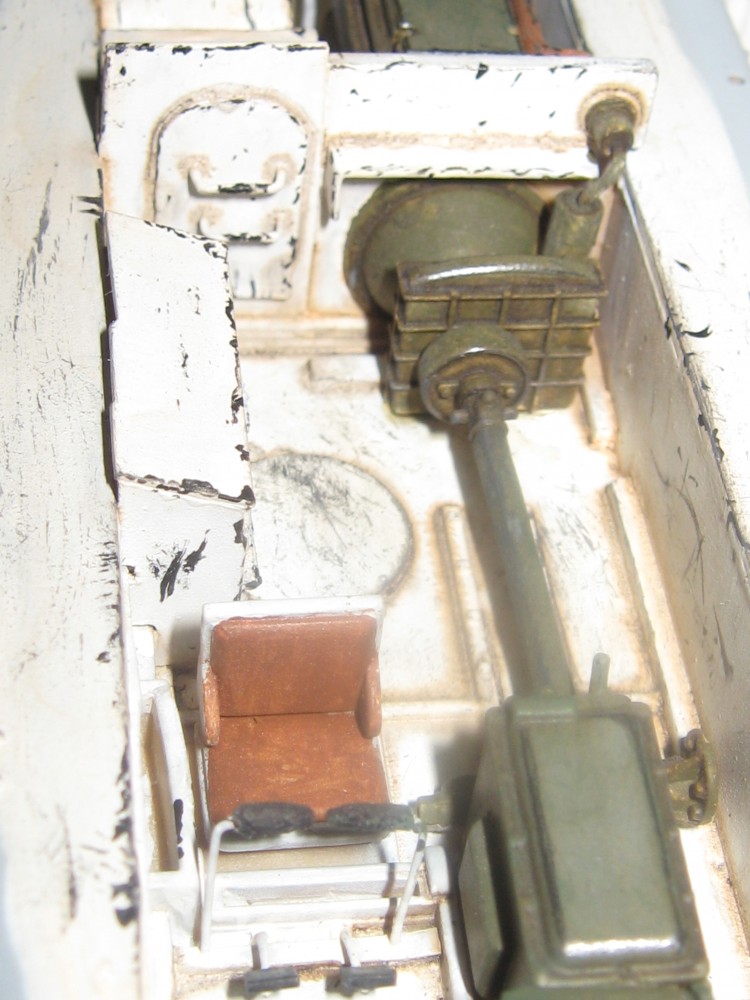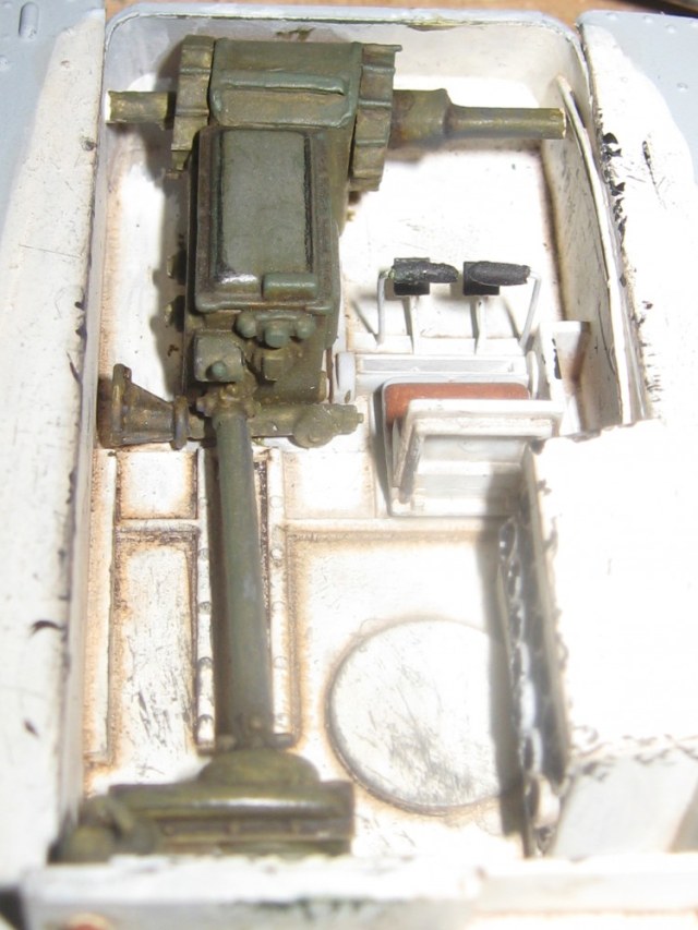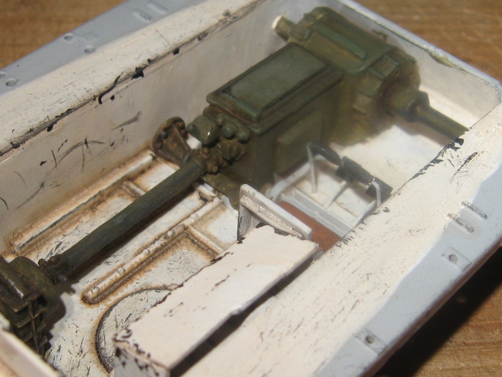 Что касается модели, то сборка из коробки без допов. Было немного деталей из интерьера но меня это не устраивало и я в первый раз по пробовал сделать интерьер с нуля из подручных средств. Получилось криво но как для первого раза думаю что не плохо, есть чему учиться. Касаемо самой модели то есть большие проблемы с ходовой. Гусеничная лента длиннее чем надо это раз, второе то что надгусеничные полки тоже не подходят и пришлось срезать концы. По покраске: красил базовый цвет песочный, аэрографом. Камуфляж кисточкой. Были нанесены самодельный фильтр, смывка.
