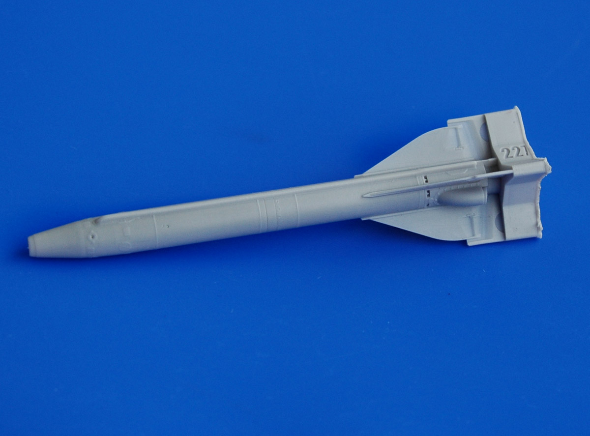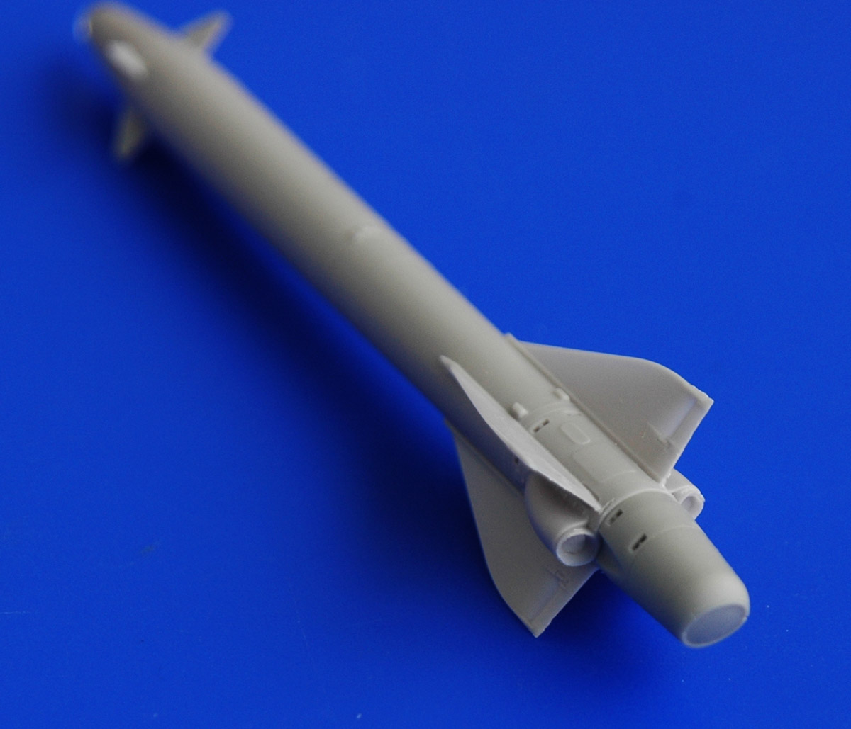 Хочется отметить продуманное технологическое членение изделия. Ракета отлита в одну деталь вместе с консолями крыльев. Отдельными деталями даны только хвостовой отсек, рули и прозрачная часть ГСН. Для любителей «ловить миллиметры», скажу сразу, опубликованные в доступных изданиях чертежи страдают рядом неточностей. При разработке 3D модели коллектив АМ использовал результаты промеров реального образца. Я сам принимал активное участие в этом проекте и со всей ответственностью могу сказать, что более точную модель Х-25 построить трудно.