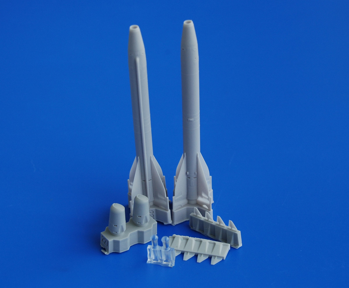 В комплекте набор деталей предназначенных для сборки двух ракет Х-25. Четыре литника из светло-серой смолы, один прозрачный литник, два литника с АПУ-68 и декаль с комплектом технических надписей.