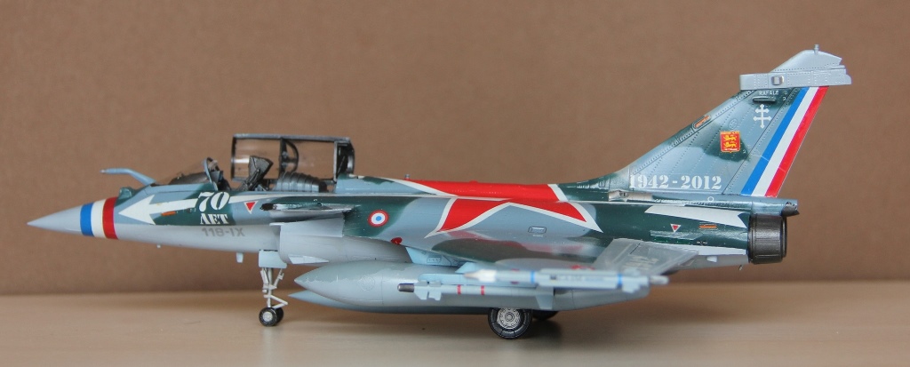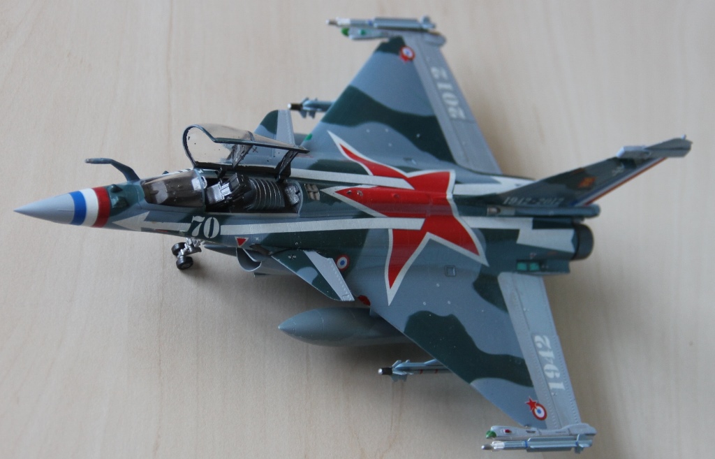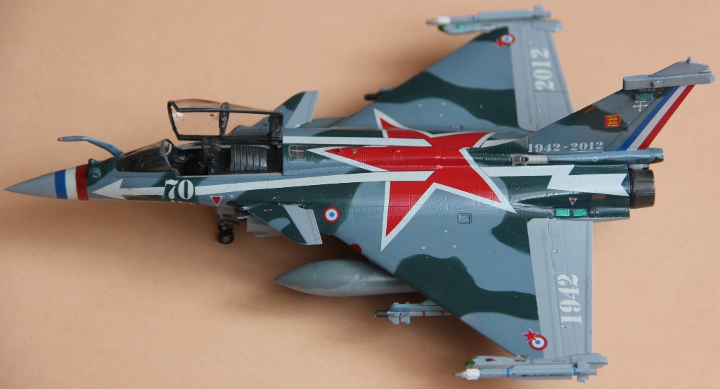 Выставляю на Ваш суд модель Rafale C от HobbyBoss-а в варианте юбилейной окраски полка "Нормандия-Неман". Модель собрана без доработок. В сборке очень приятная и лёгкая модель. Сброка и покраска доставили удовольствие. Красилась модель эмалями Humbrol и Model Master. Цвета мешал на глазок. Всё покрыто Future-ой. Была использована декаль "KD". Качество декали мне понравилось. Перевелась и приварилась хорошо.