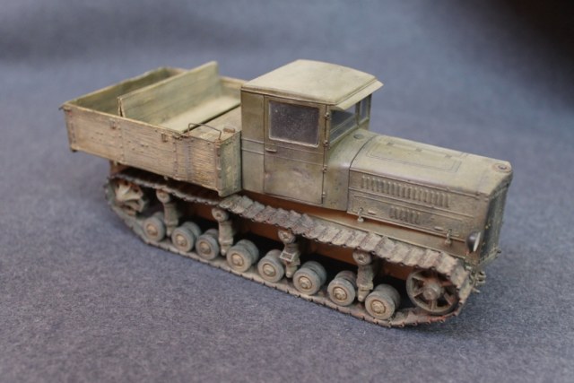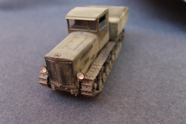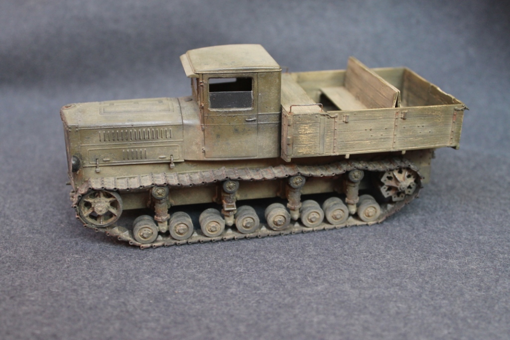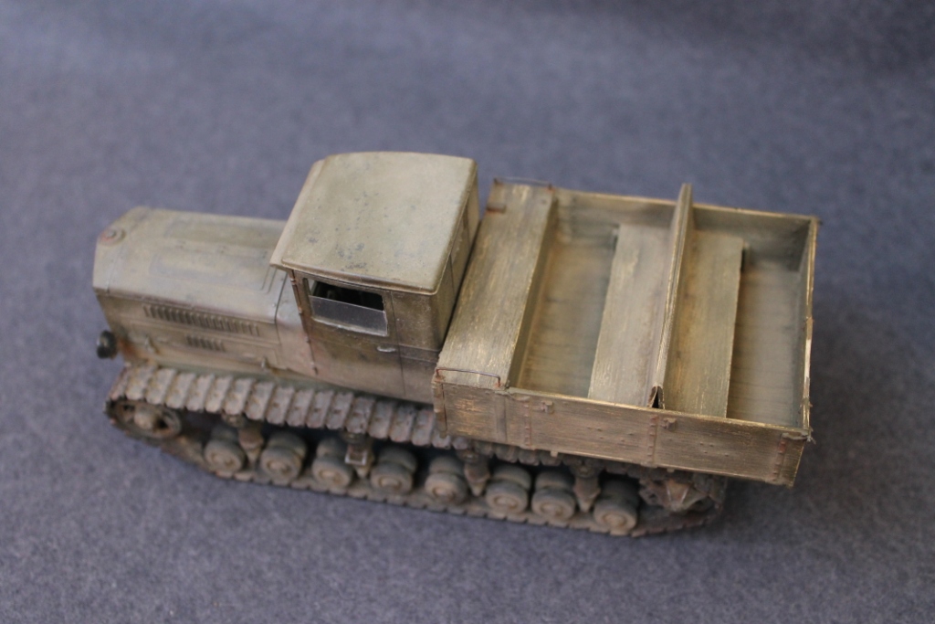 Собиралась модель неплохо, только долго. Отвлекали всякие жизненные обстоятельства. Но как бы то ни было, тягач готов и выставляется на ваш суд. Доработок было немного: исправлено китайское начертание русской буквы "и" в названии, сделана имитация трубчатых пальцев траков гусениц, заменено остекление на более тонкое, изготовлен трос и выломанная доска заднего борта..