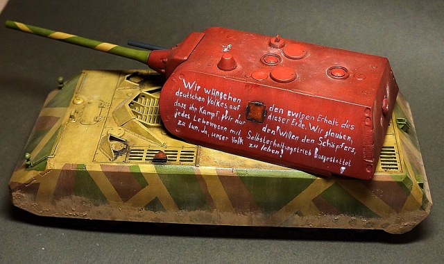 Не могу понять историю такого прототипа. Его подбили и поменяли башню? Если башня установлена позже на шасси, то почему орудие в камуфляже? В общем мешанина) грязь немного искусственно, но зато заваренные бойницы на башне супер!!