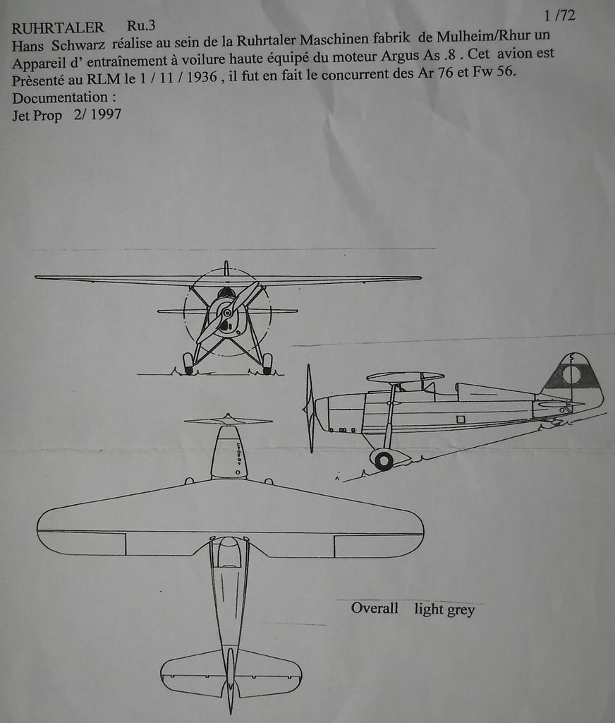 Немецкий учебно-тренировочный самолёт Ruhrtaler Ru.3 впервые полетел в 1936 году. Машина показала отличные лётные характеристики. Однако, при её испытаниях погиб сын владельца фирмы. Работы были свёрнуты, в серию пошёл Focke-Wulf Fw 56.