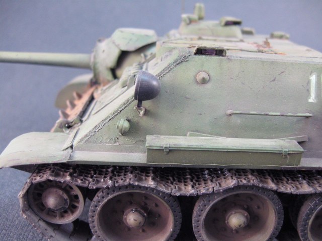 Представлю свою четвертую модель – СУ-85. Основа всем известная Tamiya, низ ванны от Т-34 (MSD). Попытался собрать модель более менее приближенную к оригиналу. При строительстве использовалось фототравление ABER, ствол заменил на металлический от ModelPoint, траки от Sector35. Также добавил не достающие сварные швы из тянутого литника, кое где добавил не достающие болты, сделал оптику из DVD, переделал катки, добавил фару от Elf.