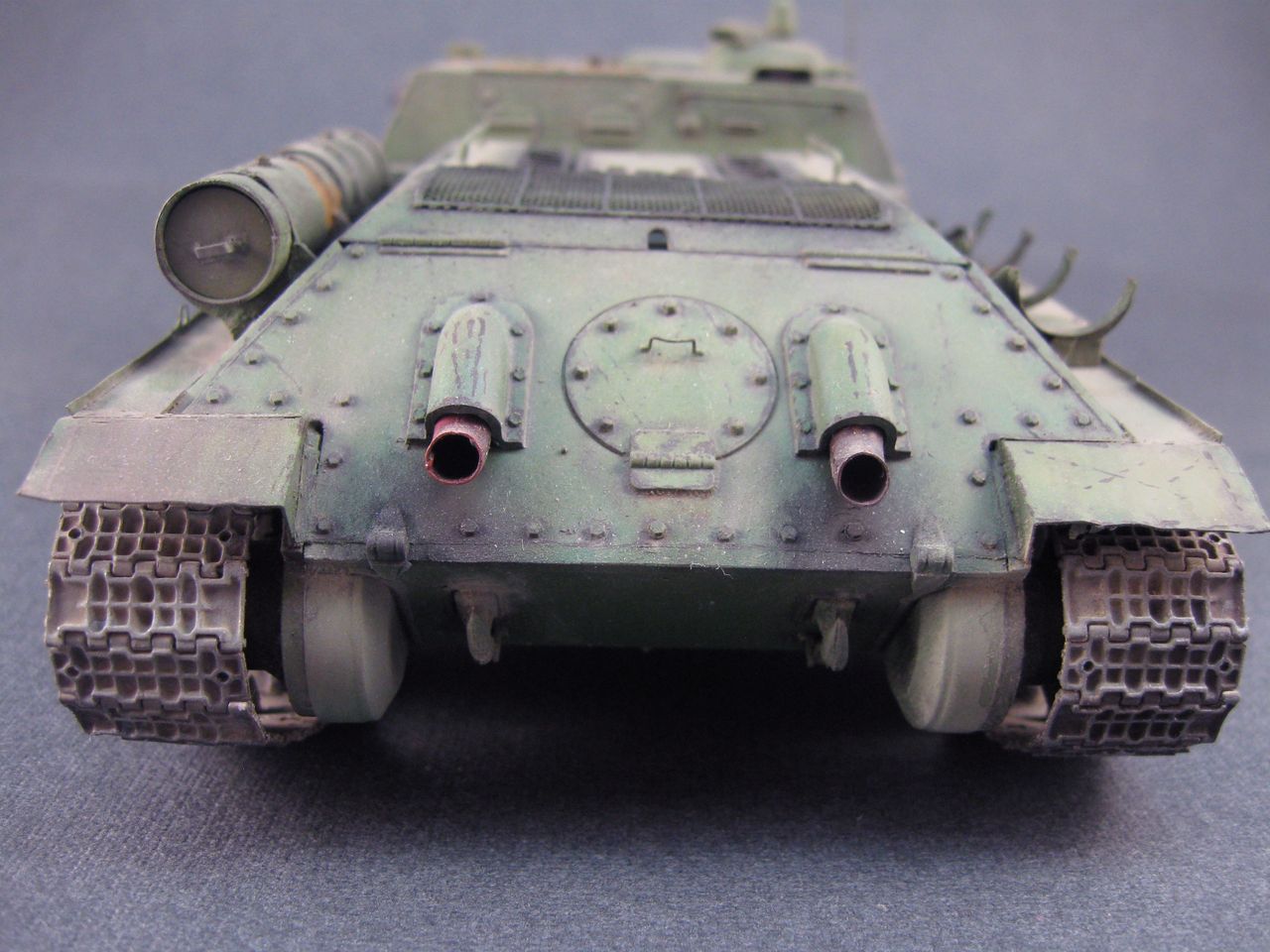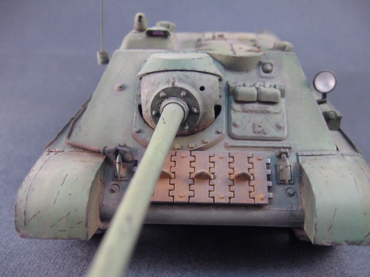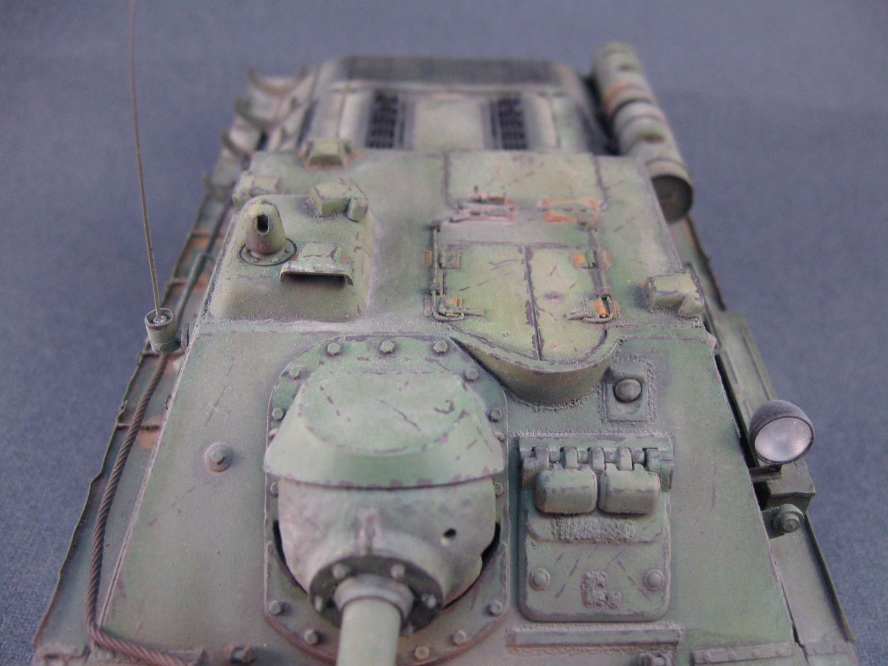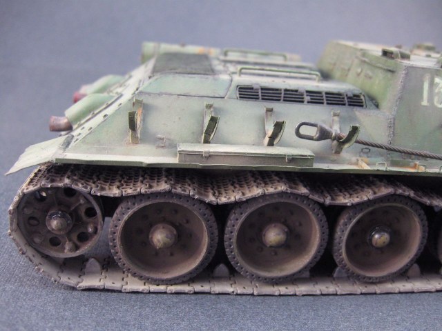 Но это шутка. Работа очень понравилась. Единственные недочеты, на мой взгляд, - это уж очень рыжая и неестественая ржа на топливных баках по левому борту машины и на верхней плите башни, и перебор с... не со сколами) а с царапинами на корпусе. Работа понравилась очень