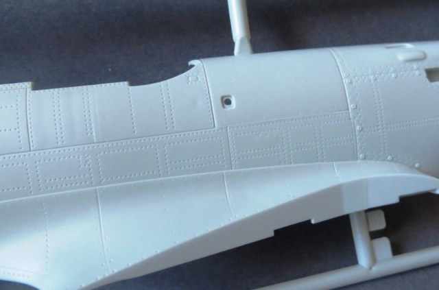 Модель сделана с аккуратной внутренней расшивкой и внутренней клёпкой. На крыле сверху и снизу клёпка очень даже приличная( по размеру – достаточно мелкая), на фюзеляже чуть крупнее( вероятно, из-за технологии литья?), но вполне уместная – если чуть шлифануть, то вообще будет всё правдоподобно. А вот поработать мелкой шкуркой необходимо –есть кое-где мелкие утяжины, особенно на фюзеляже. Все выступающие части вроде наплывов и маленьких заборников сделаны отдельно от крыла и фюзеляжа. Выхлопные патрубки сделаны раздельными из 2х половин –т.е. при склейке можно сделать и сварной шов от клея и внутри они получаются полыми. Все вращающие части – элероны, рули высоты и т.д. сделаны отдельно – можно расположить как угодно. Сделаны отклоняемые закрылки. Правда, меня критиковали за то, что я сделал на Спитфайре 9 закрылки выпущенными, дескать так не бывает. Но фото есть фото.