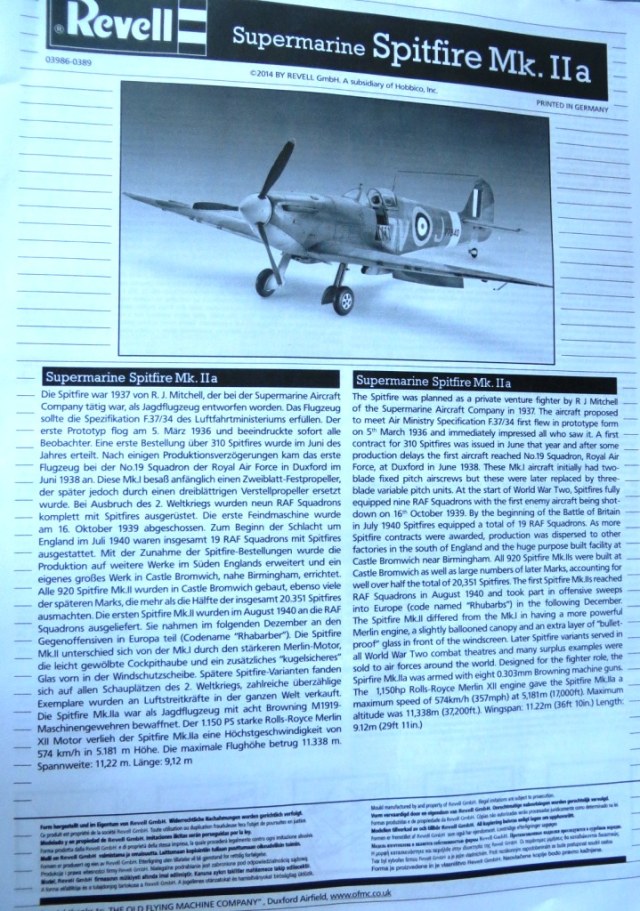 Новинка от Revell,всем известного истребителя.Коробка с боковой загрузкой,литники светло серого цвета без облоя и утяжин,внутренняя расшивка,хорошо выполненная. Инструкция на 8 страницах,деколь на 2 варианта маркировки,фонарь отличного качества.Думаю модель будет приятной в сборке.