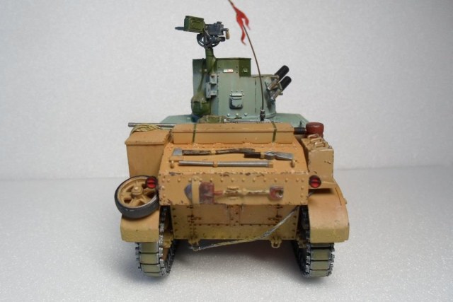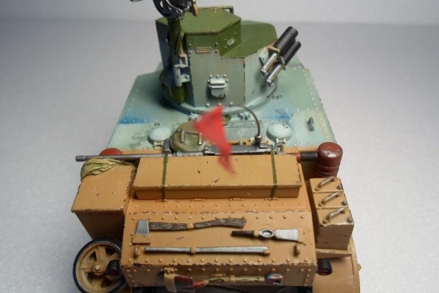 Вполне симпатичная работа. Но...согласен с замечанием о пулемете. Это же касается антенны (либо черный либо в базе) и шанцевого инструмента, троса, казенной части мортирок и подставки под пулемет. Крепление троса, стоило бы выделить, сейчас оно закрашено, и кажется что трос просто лежит на ВЛД. Не хватает смывки, болты и некоторые детали, стоило бы пролить, и тем самым выделить.