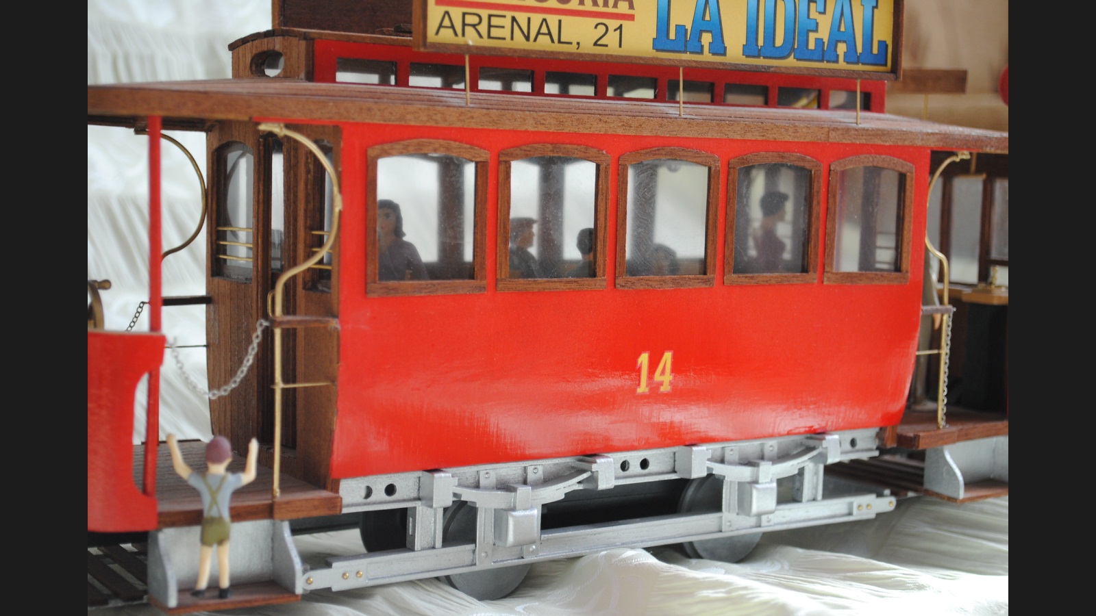 Дно салона как и кабин выложено рейками сапели, крыша тоже, двери в салон. Стулья в салоне обычными рейками, 0.3 мм. Красил морилкой. Краска в основном использовалась «невская палитра». Наносилась кистью в кучу слоев. За исключением деталей, окрашенных в «золото» - руль, поручни и т.д.. Здесь «Tikkurila». Благо оставались остаточки). Затем задуто глянцевым лаком «Босния». Пантограф и рельсы хромовая краска из баллона. Номера и реклама вырезаны из распечатки, наклеены на клей карандаш и задуты лаком. Пассажиров и водитель заказывал отдельно в Китае набором. Обошлись в 9$ - 12 штук. Покрашены были ужасно, без лиц. Пришлось дорабатывать, правда не своими силами, знакомая художница выручила. Также додумал подсветку в салоне, светильник сделал из картона, пару светодиодов из дешевого фонарика, потоциометр друг подогнал). Питание 9V, блок для батареи с выключателем. Все из того же Китая. Цепочка тоже отдельно приобреталась, не с набора.