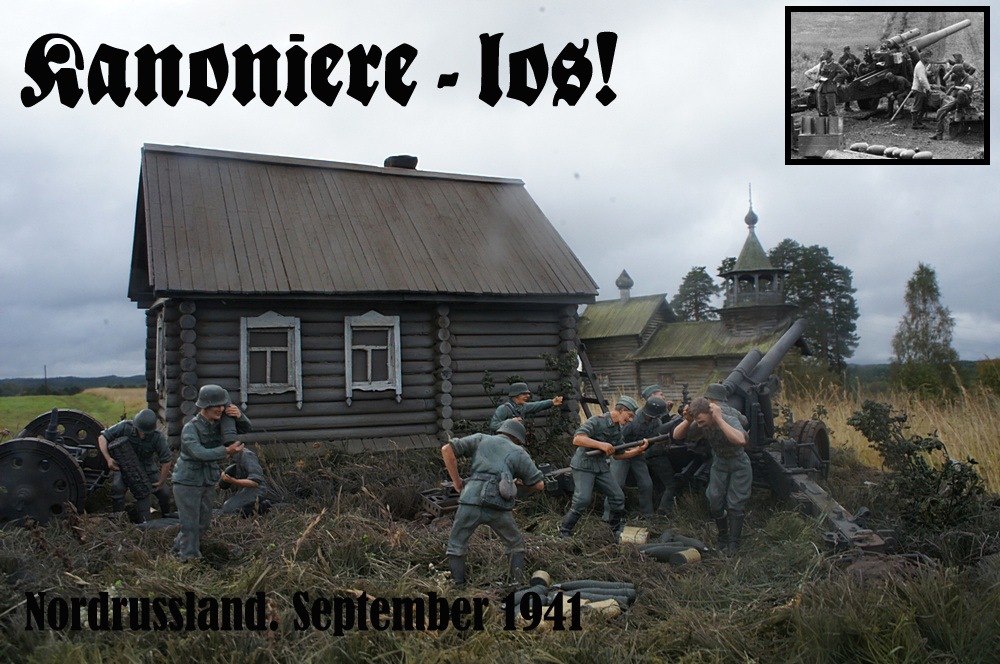 Работа создавалась в рамках конкурса. посвященного артиллерии на сайте диорама.ру. Дом от Бастион35, немного доработанный (завалинка, труба и печь от масштаб). Орудие и фигуры от Трумпетер. Солдатики достаточно "уродливые" изначально но попробовал использовать этот набор. Работа также одна из старых, закончена в августе 2012г. Фотосессия проходила в Карелии, в деревне Маньга. Местные пейзажи показались мне весьма удачными для реализации замысла.