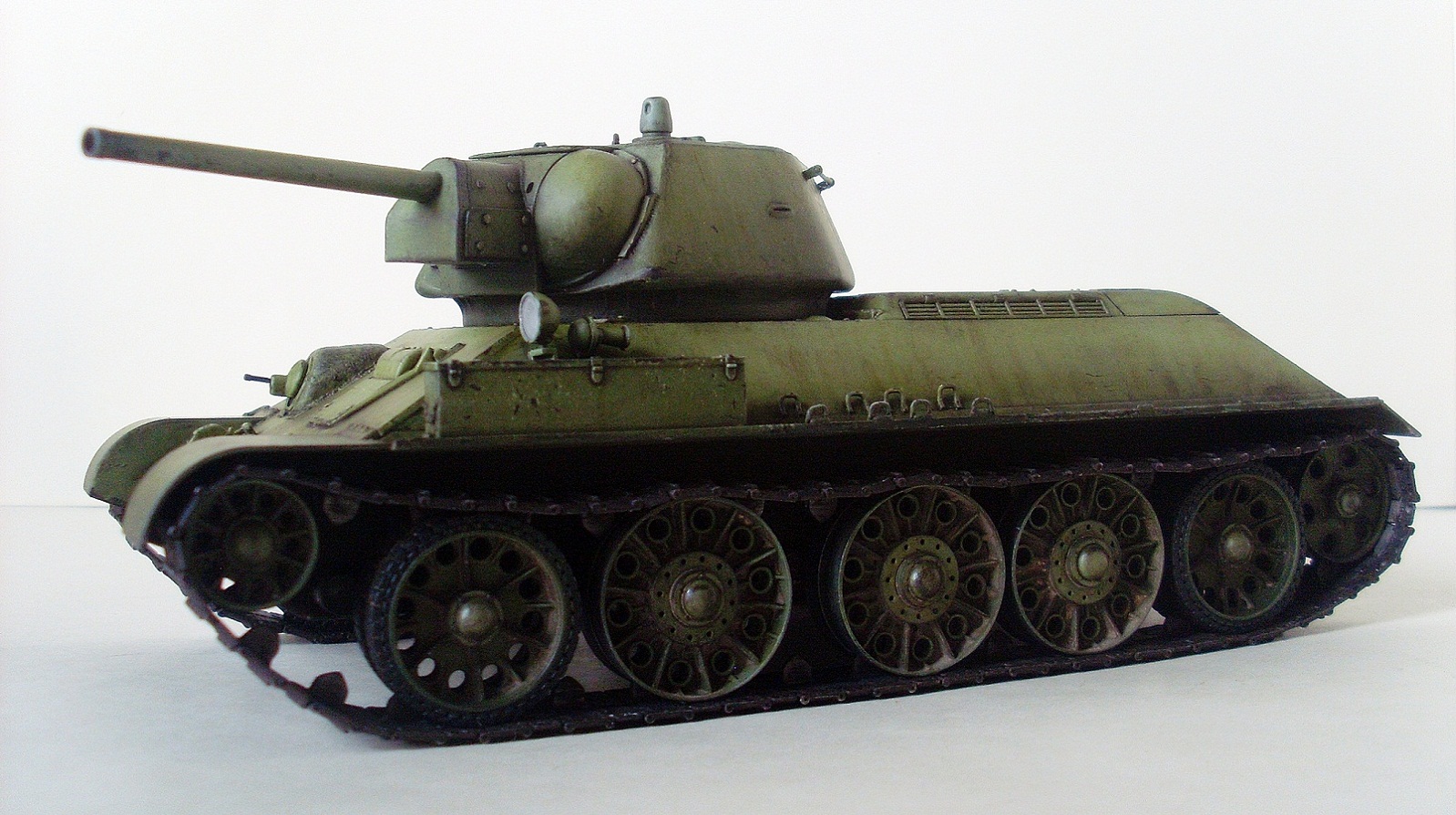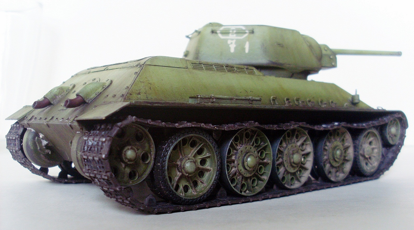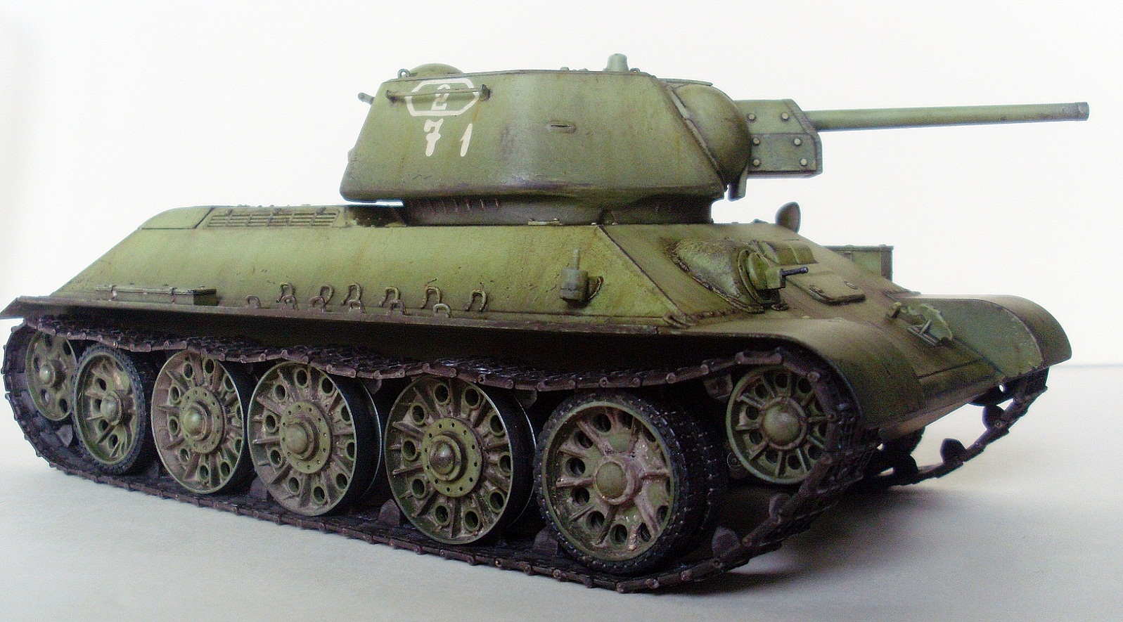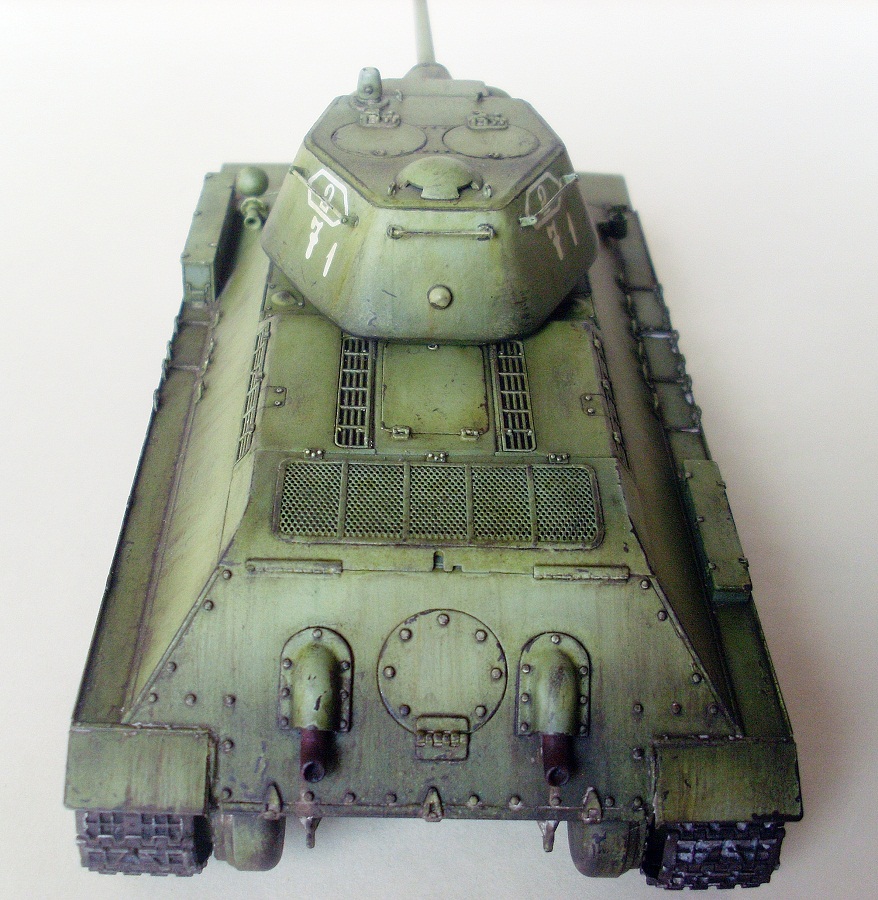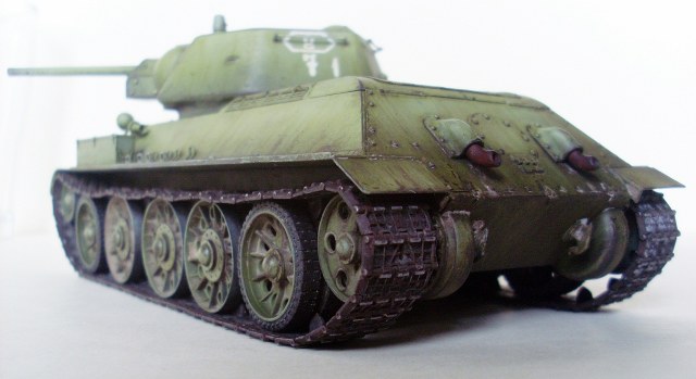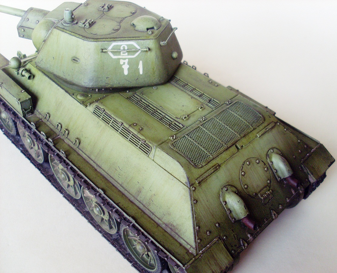 Модель отличная. Да, глушаки можно было рассверлить. На мой взгляд, крупноватые петли для крепления запасных траков и грунтозацепов. И добавить потертости на башне вокруг люков . Это самое затираемое место на башне. На данной модели потертостей вообще нет. По поводу мат. части знатоки скажут или уже сказали. Но мне кажется судить строго по мат. части Т-34 сложно. Так как выпускалось многими заводами и поставки были различными комплектующими, плюс огромное количество выпущенных танков, различная ремонтная база.