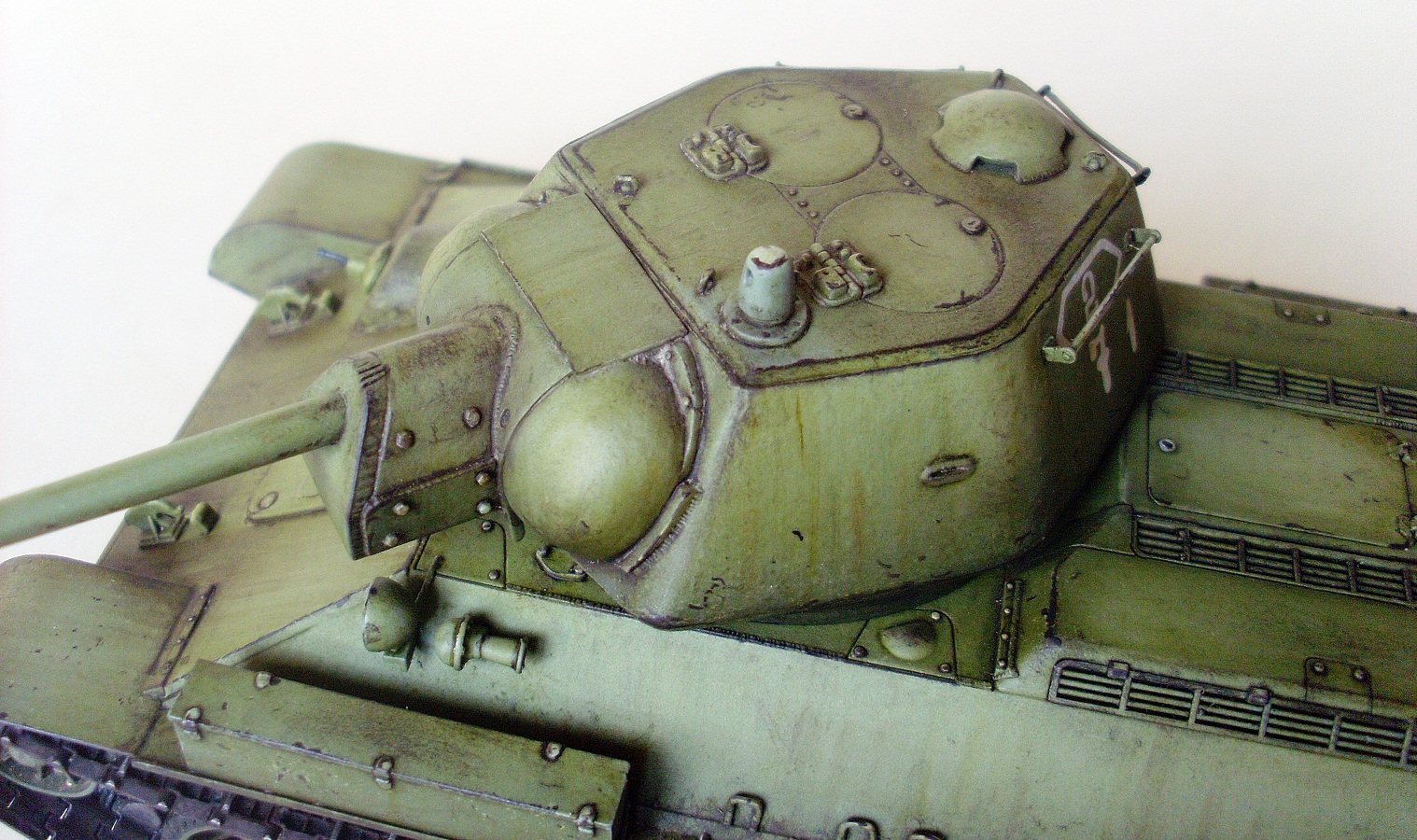 Нет планки перед люком мехвода, ранний ящик ЗИП, бронировка курсового пулемета не верна, сеточка ТО из набора со скругленными гранями, а должна быть с прямыми, нет ручки на люке ТО на ВКД.